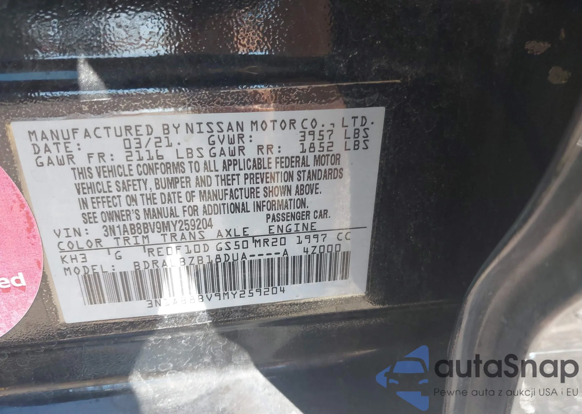 VIN: 3N1AB8BV9MY259204