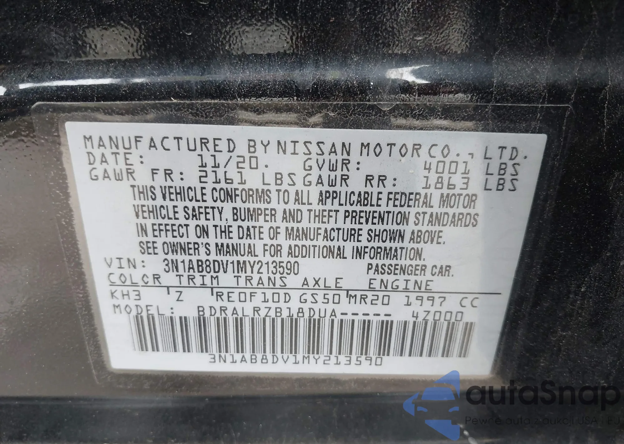 VIN: 3N1AB8DV1MY213590
