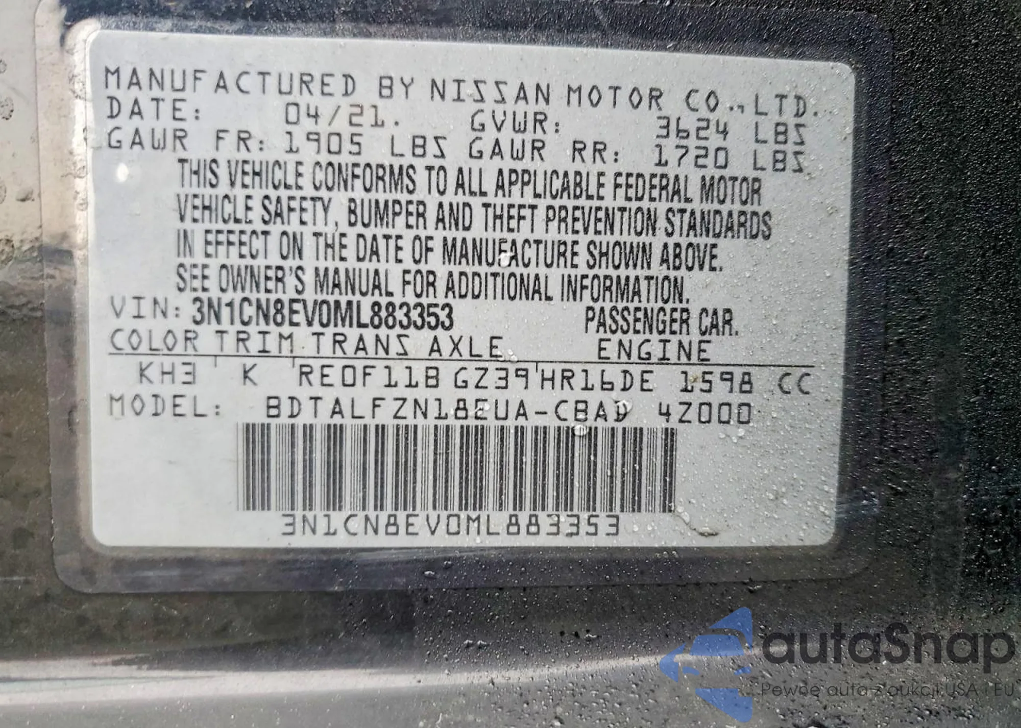 Автомобиль Nissan Versa 2021 (VIN 3N1CN8EV0ML883353) ранее не участвовал в торгах. Документы чистые, пробег соответствует или ниже среднего по рынку. Продаётся страховой компанией — рекомендуем покупку. Доставка в порт займет около 6–8 недель.