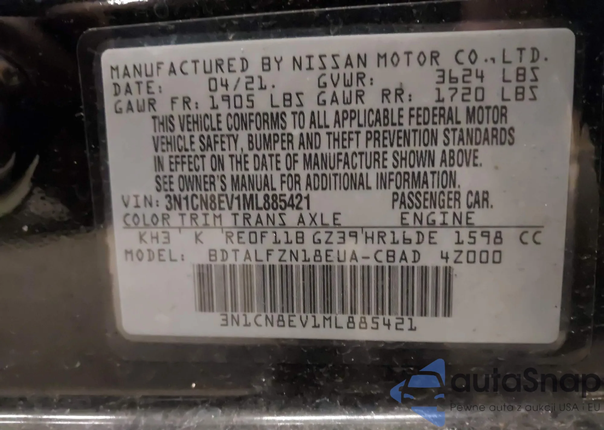 Автомобиль Nissan Versa 2021 (VIN 3N1CN8EV1ML885421) ранее не участвовал в торгах. Документы чистые, пробег соответствует или ниже среднего по рынку. Продаётся страховой компанией — рекомендуем покупку. Доставка в порт займет около 6–8 недель.