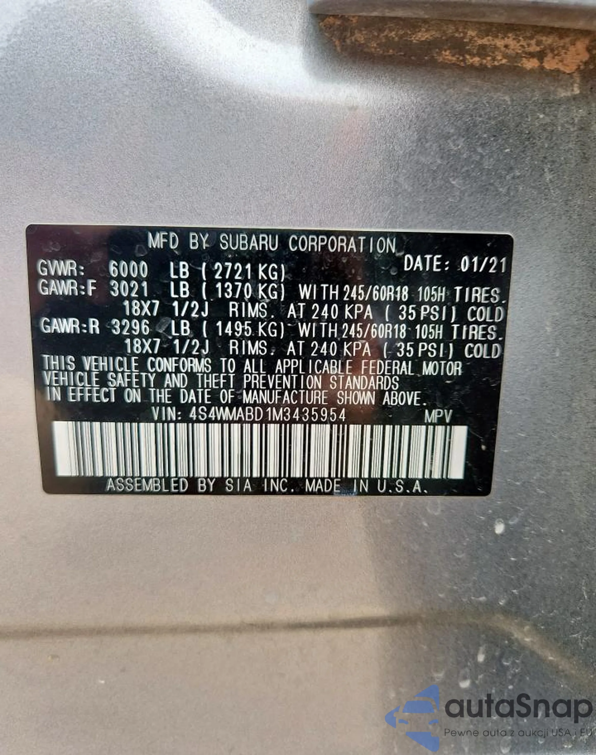 Автомобиль Subaru Ascent 2021 (VIN 4S4WMABD1M3435954) имеет документы, препятствующие регистрации. Могут возникнуть сложности при экспорте и регистрации. Обратитесь к экспертам AutaSnap для поиска альтернатив.