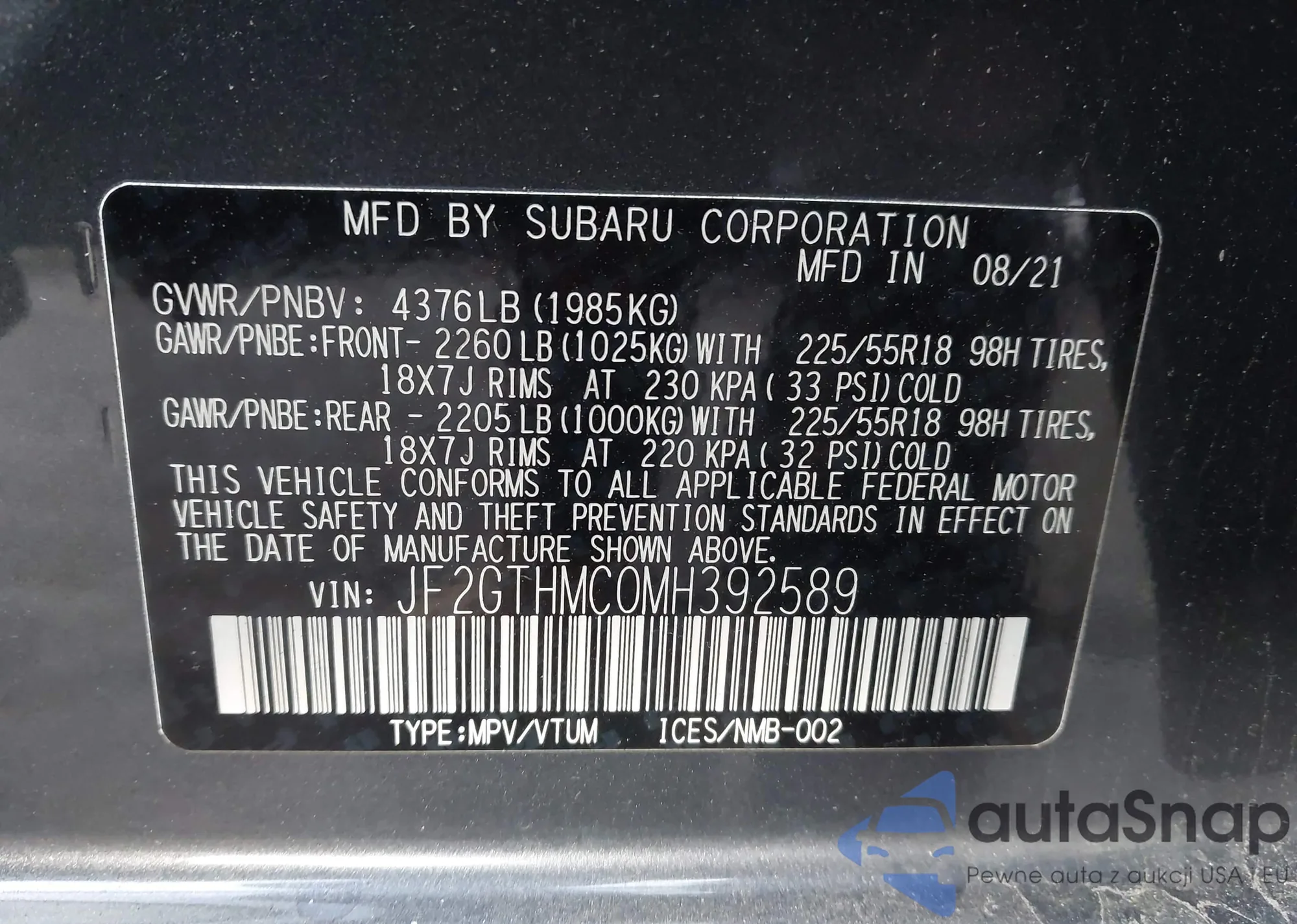 • VIN: JF2GTHMC0MH392589