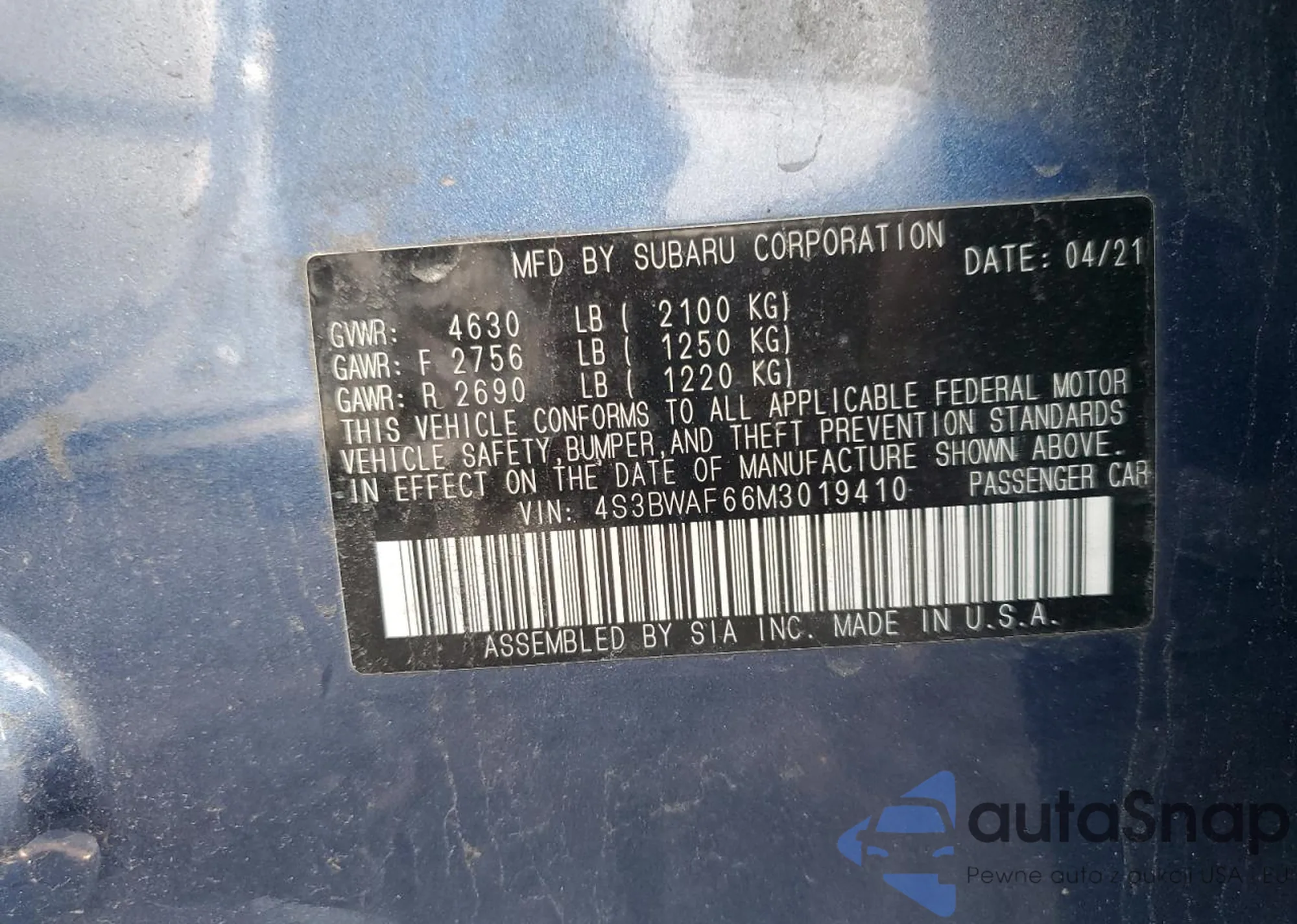 Автомобиль Subaru Legacy 2021 (VIN 4S3BWAF66M3019410) продаётся непроверенным продавцом. Рекомендуем проверить отчет Carfax и подтвердить возможность регистрации перед покупкой.