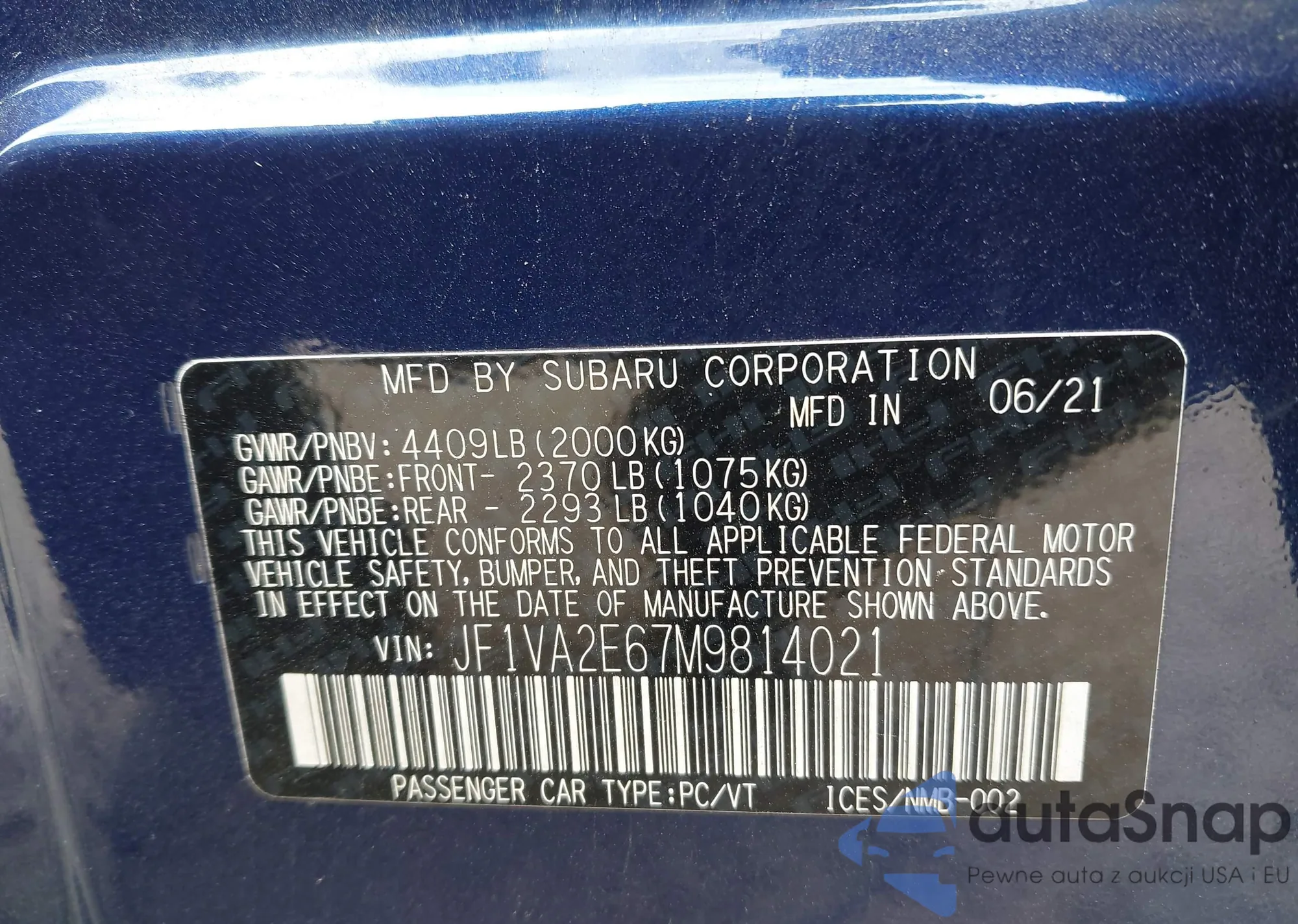 Автомобиль Subaru WRX STi 2021 (VIN JF1VA2E67M9814021) имеет документы, препятствующие регистрации. Могут возникнуть сложности при экспорте и регистрации. Обратитесь к экспертам AutaSnap для поиска альтернатив.