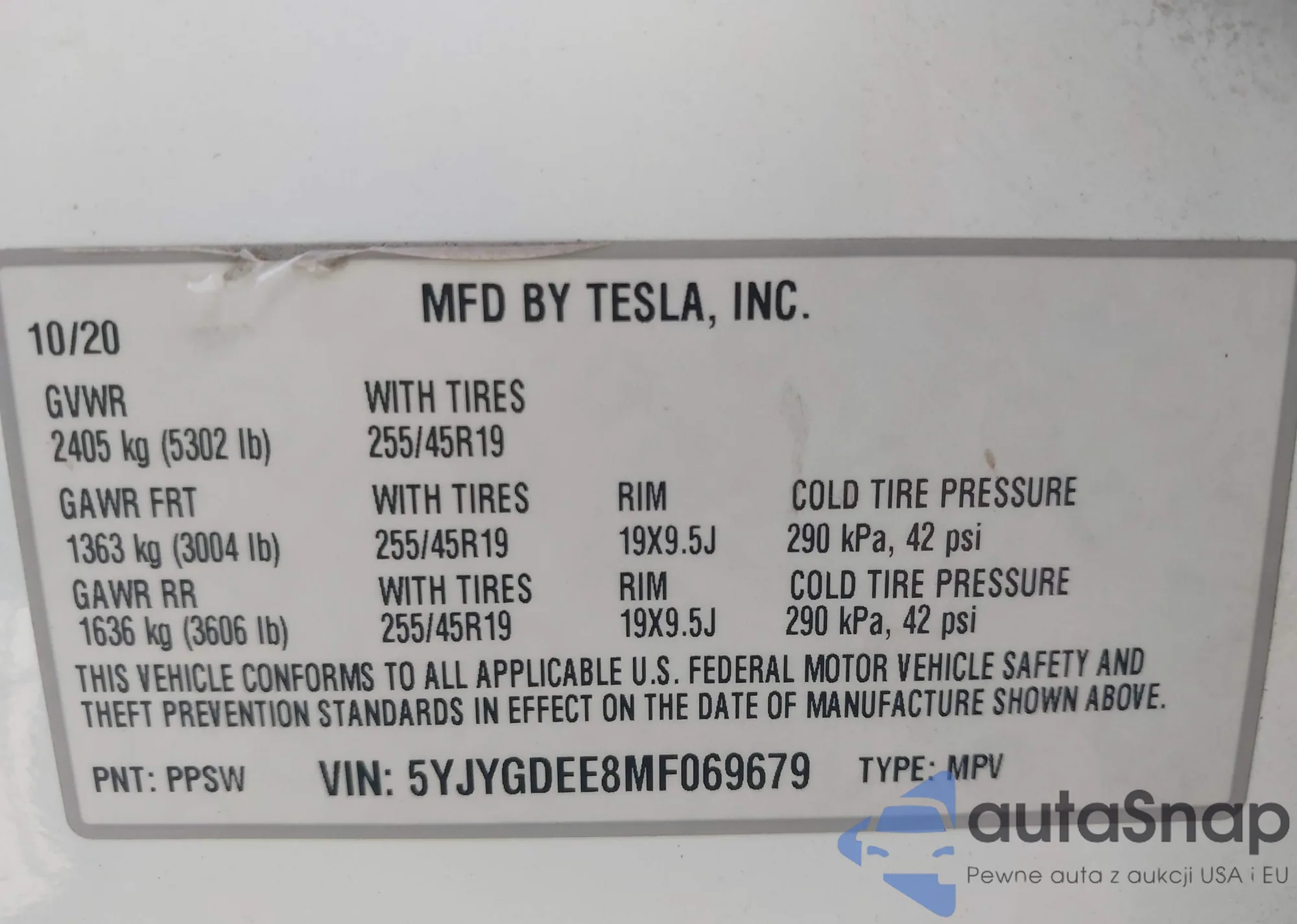 • VIN: 5YJYGDEE8MF069679