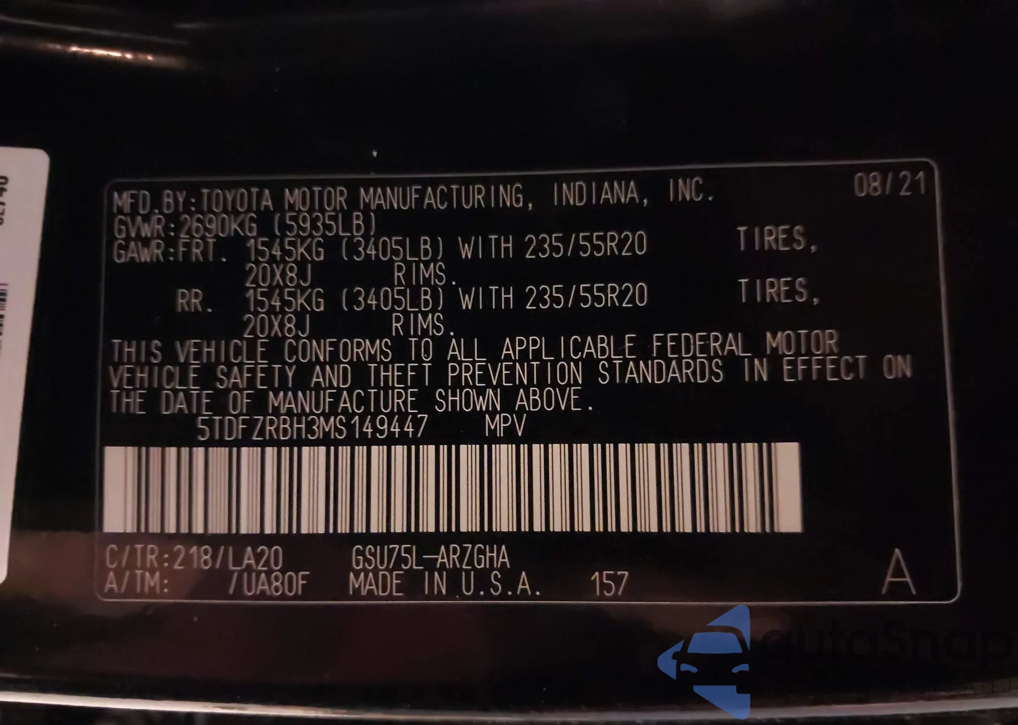 • VIN: 5TDFZRBH3MS149447