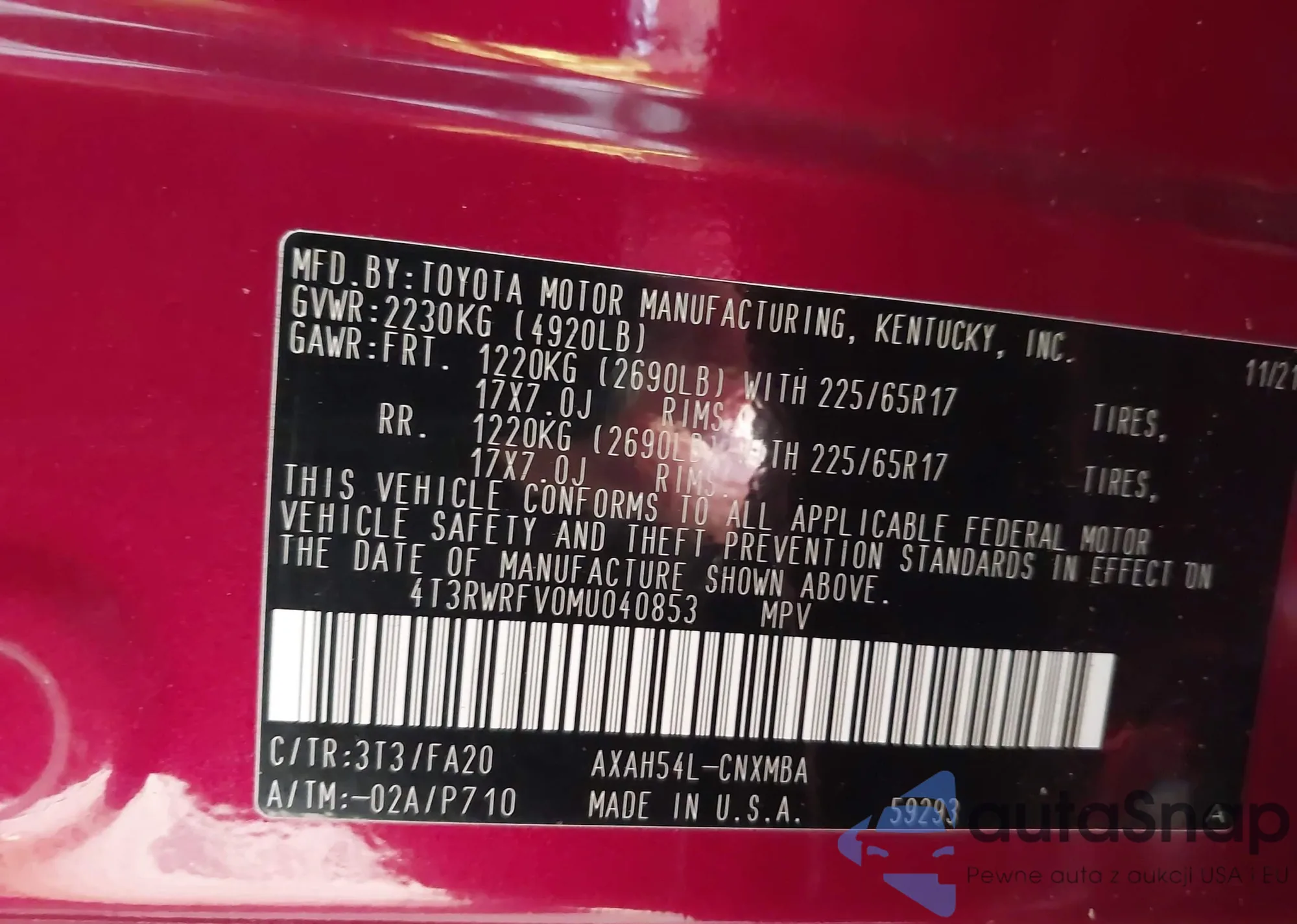 Автомобиль Toyota RAV 4 2021 (VIN 4T3RWRFV0MU040853) имеет документы, препятствующие регистрации. Могут возникнуть сложности при экспорте и регистрации. Обратитесь к экспертам AutaSnap для поиска альтернатив.