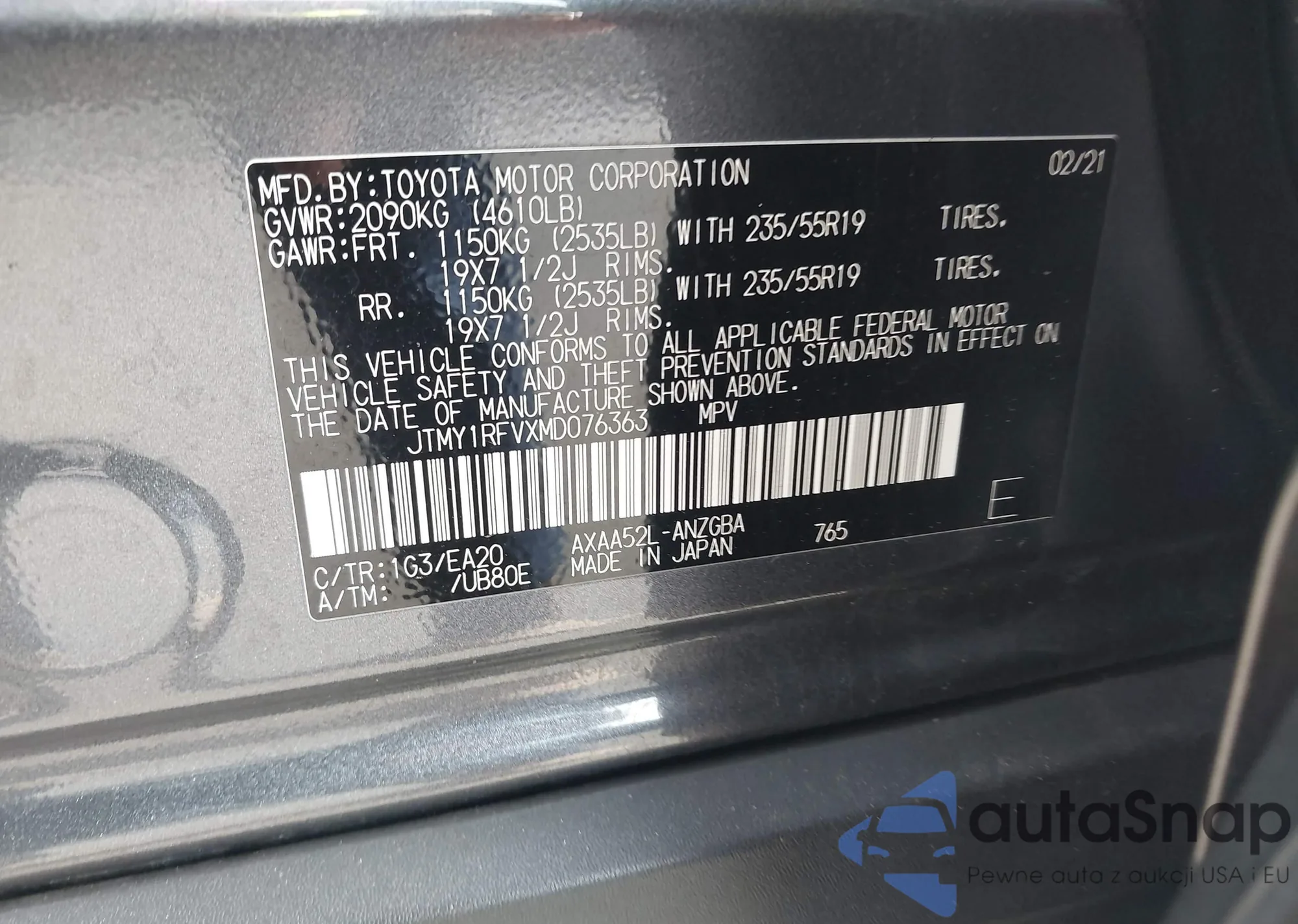 Автомобиль Toyota RAV 4 2021 (VIN JTMY1RFVXMD076363) ранее не участвовал в торгах. Документы чистые, пробег соответствует или ниже среднего по рынку. Продаётся страховой компанией — рекомендуем покупку. Доставка в порт займет около 6–8 недель.