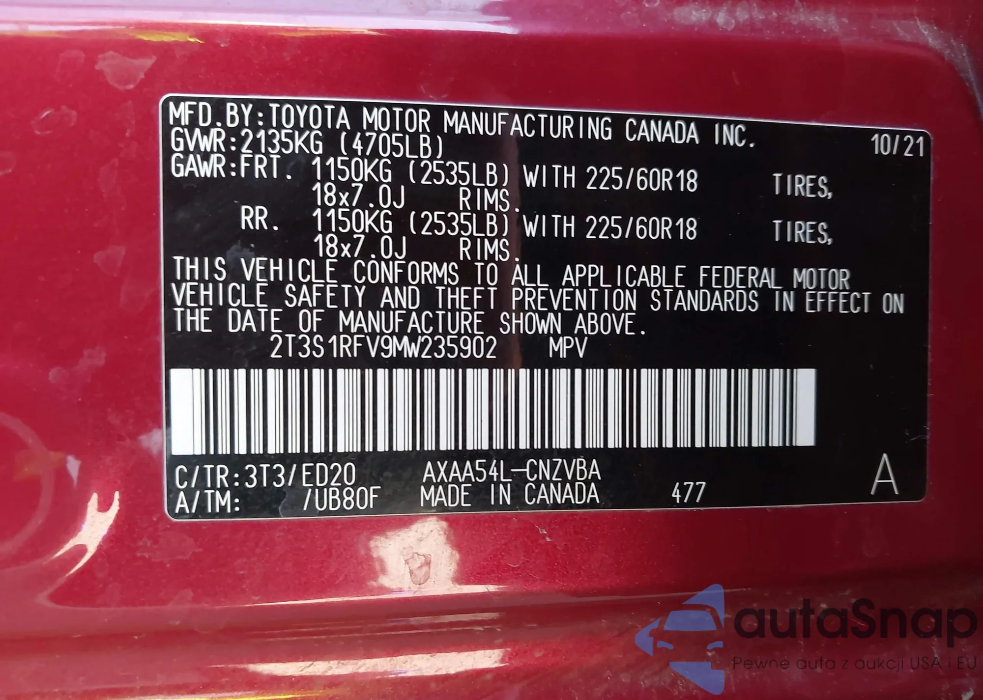 • VIN: 2T3S1RFV9MW235902