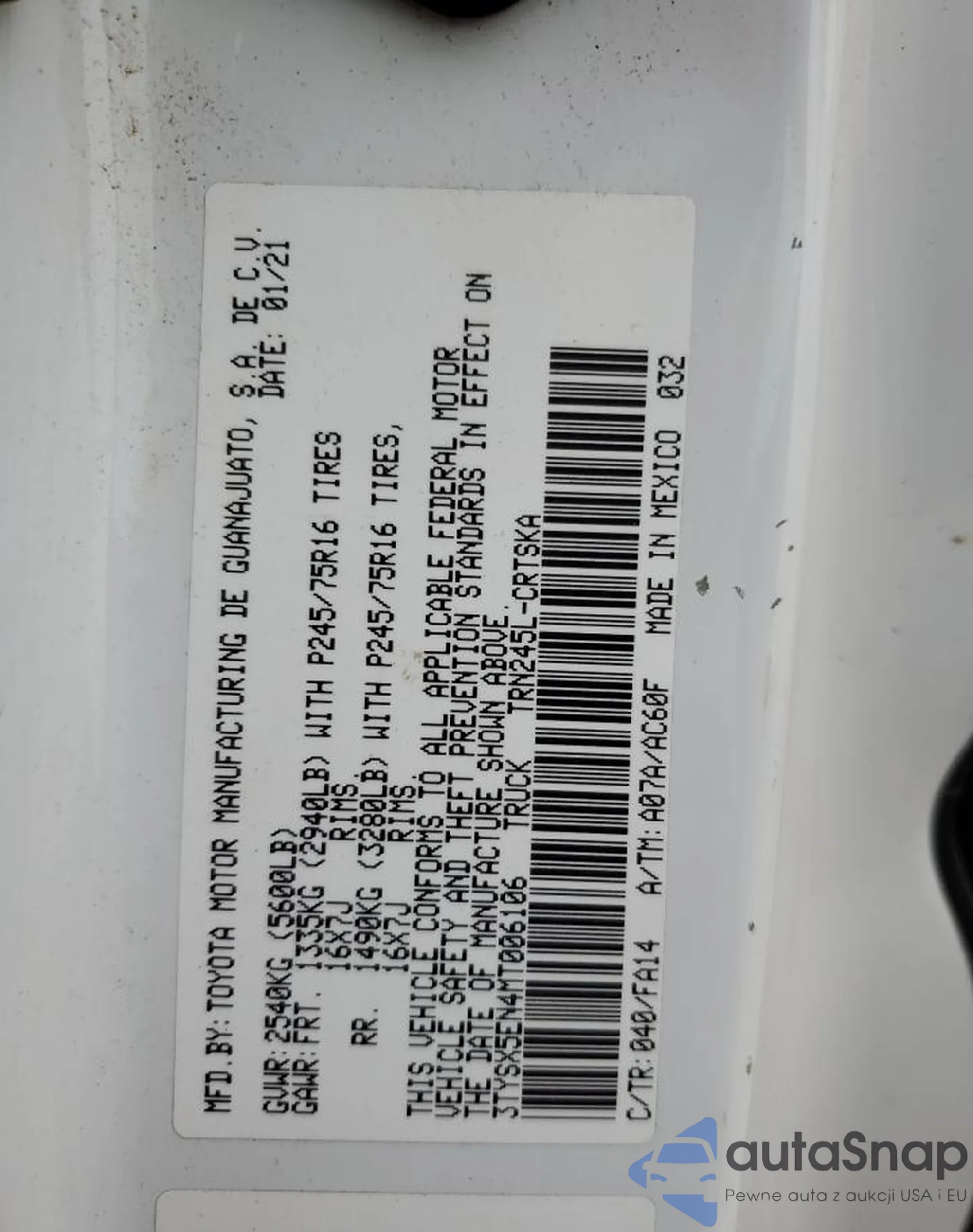 VIN: 3TYSX5EN4MT006106