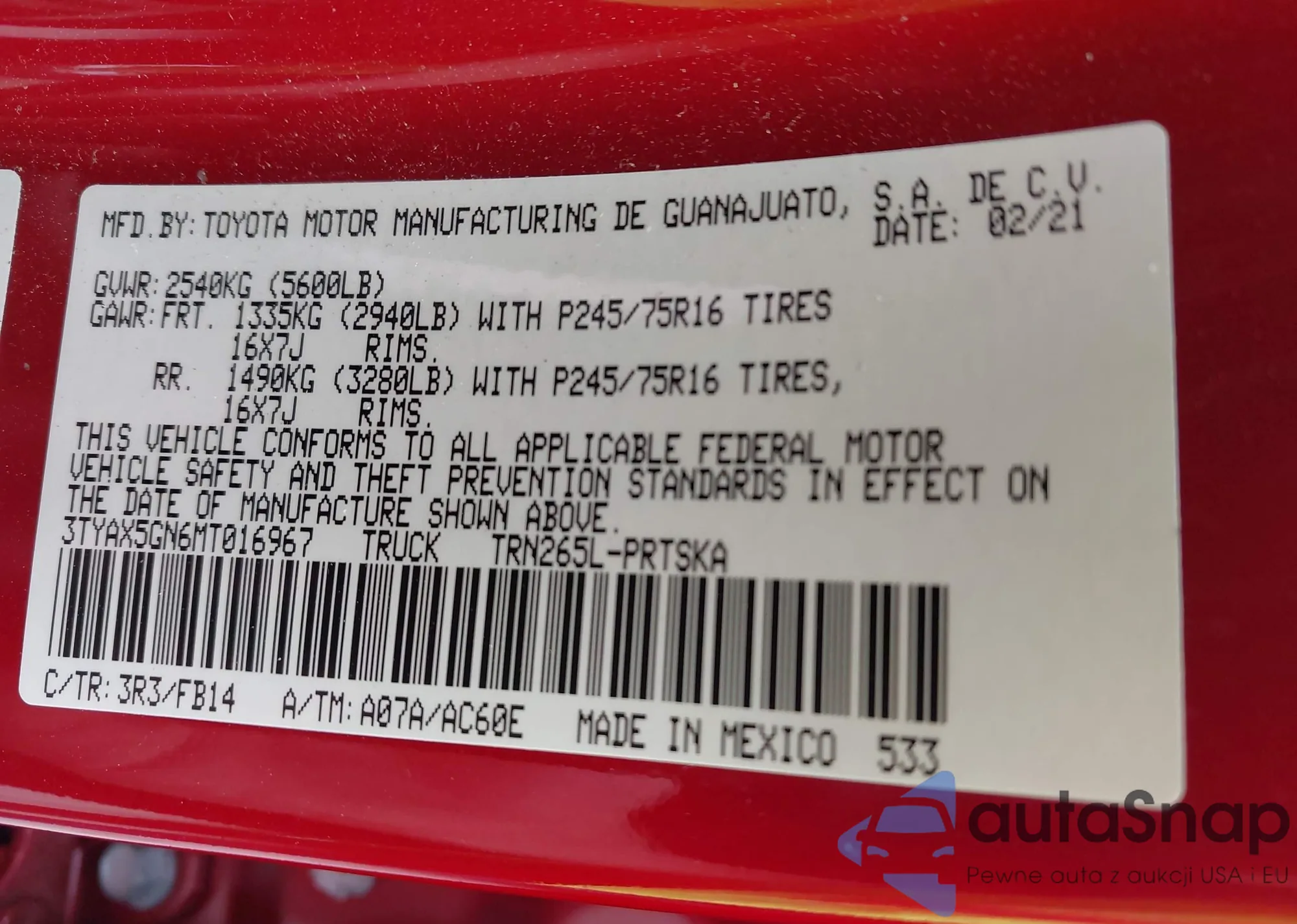 VIN: 3TYAX5GN6MT016967