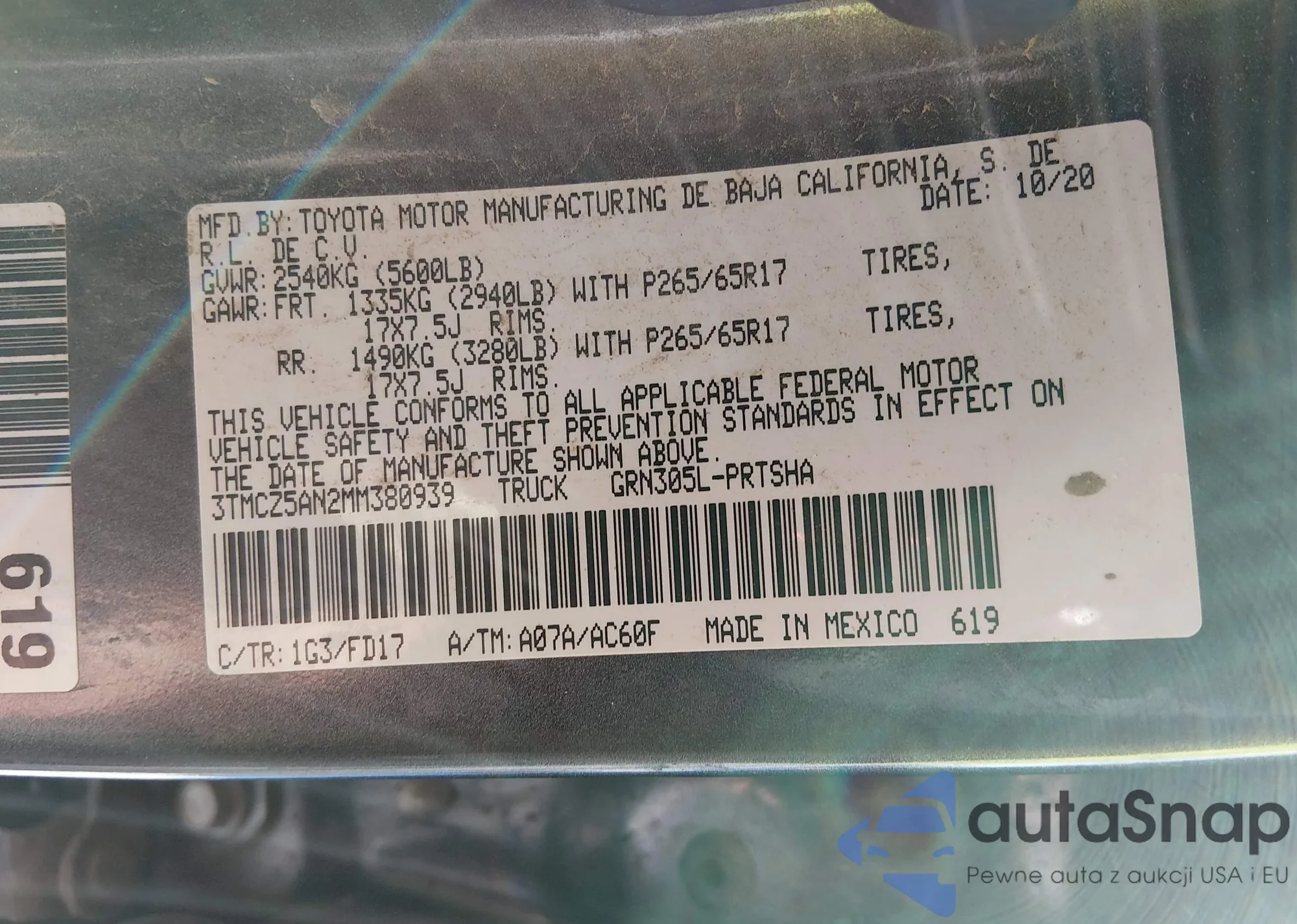 Автомобиль Toyota Tacoma 2021 (VIN 3TMCZ5AN2MM380939) ранее не участвовал в торгах. Документы чистые, пробег соответствует или ниже среднего по рынку. Продаётся страховой компанией — рекомендуем покупку. Доставка в порт займет около 6–8 недель.