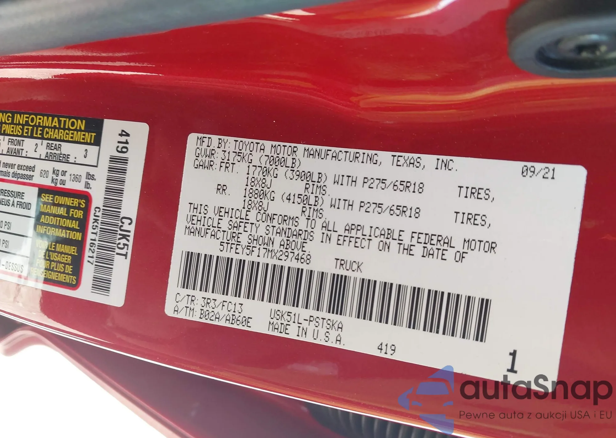 Автомобиль Toyota Tundra 2021 (VIN 5TFEY5F17MX297468) ранее не участвовал в торгах. Документы чистые, пробег соответствует или ниже среднего по рынку. Продаётся страховой компанией — рекомендуем покупку. Доставка в порт займет около 6–8 недель.