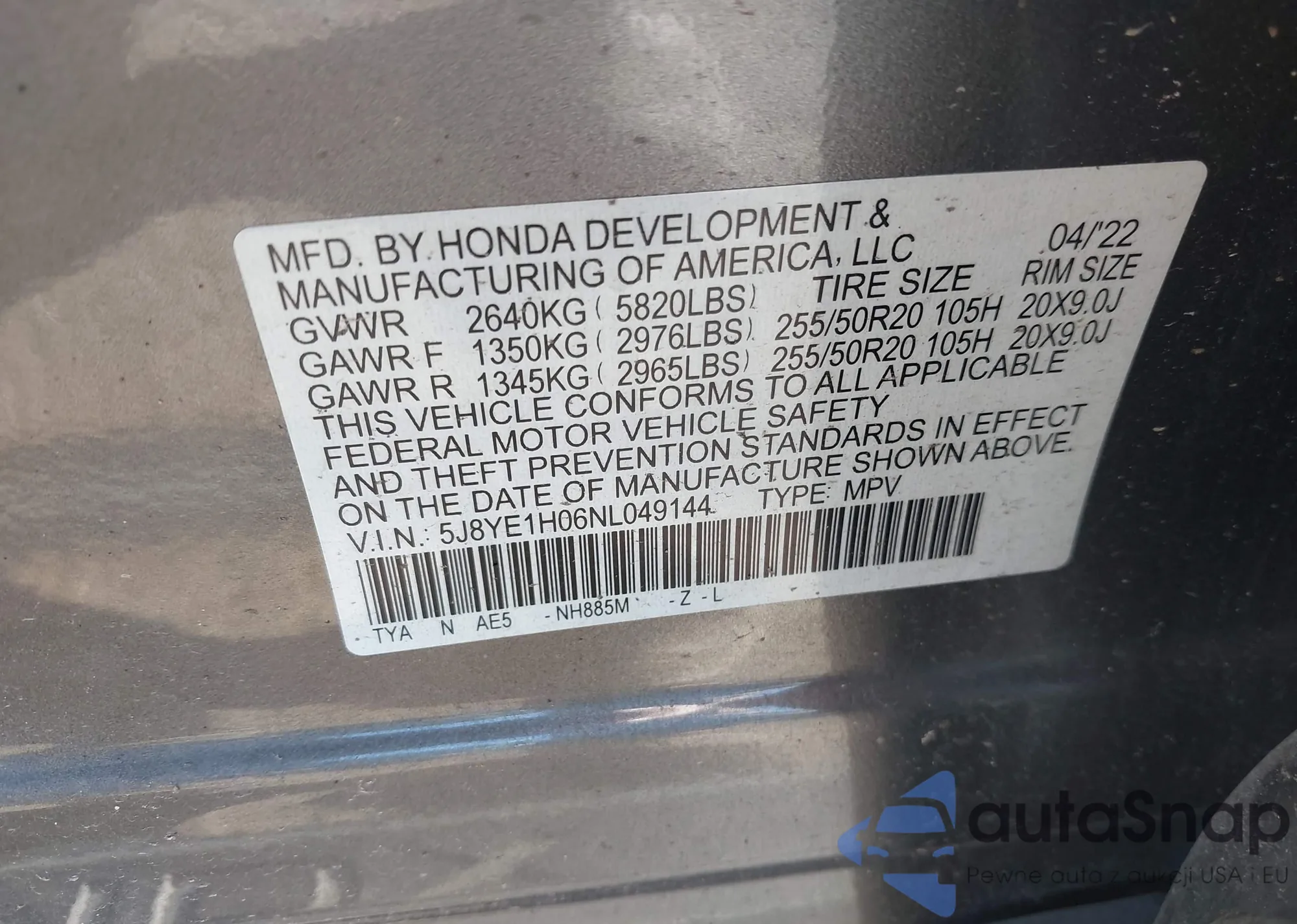 Автомобиль Acura MDX 2022 (VIN 5J8YE1H06NL049144) имеет документы, препятствующие регистрации. Могут возникнуть сложности при экспорте и регистрации. Обратитесь к экспертам AutaSnap для поиска альтернатив.
