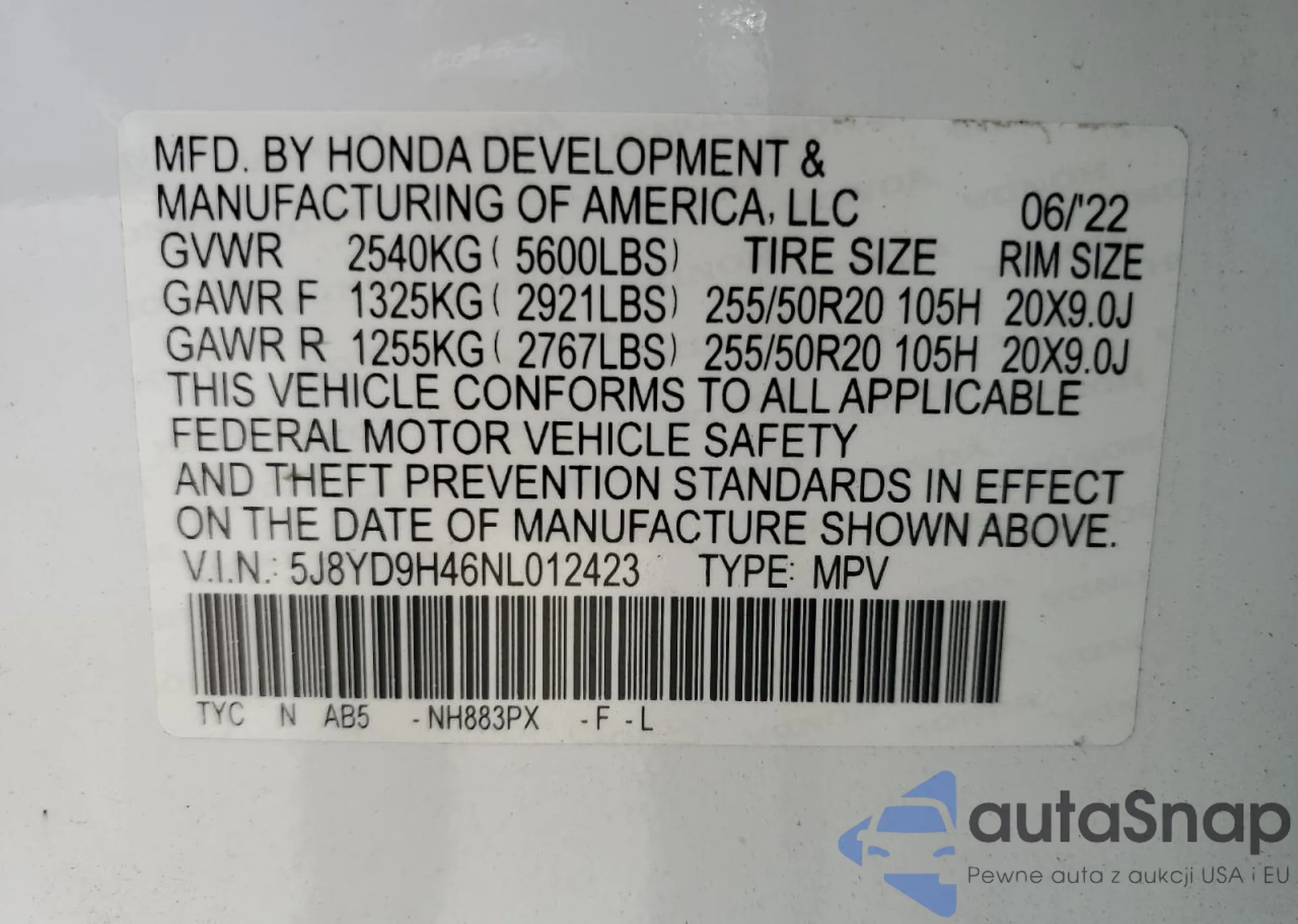 VIN: 5J8YD9H46NL012423