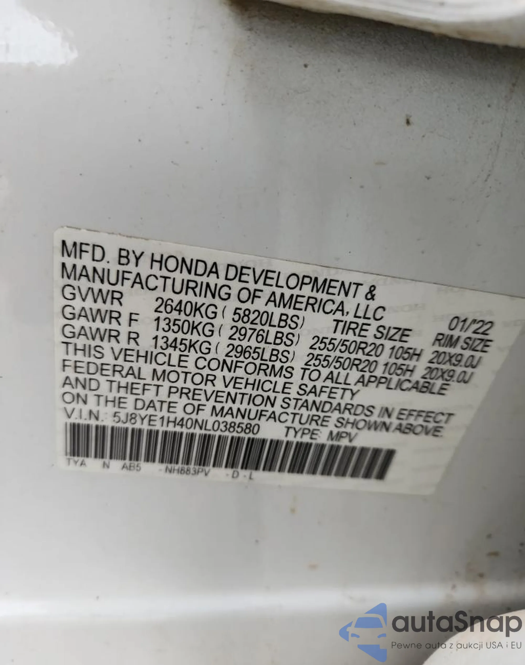 VIN: 5J8YE1H40NL038580