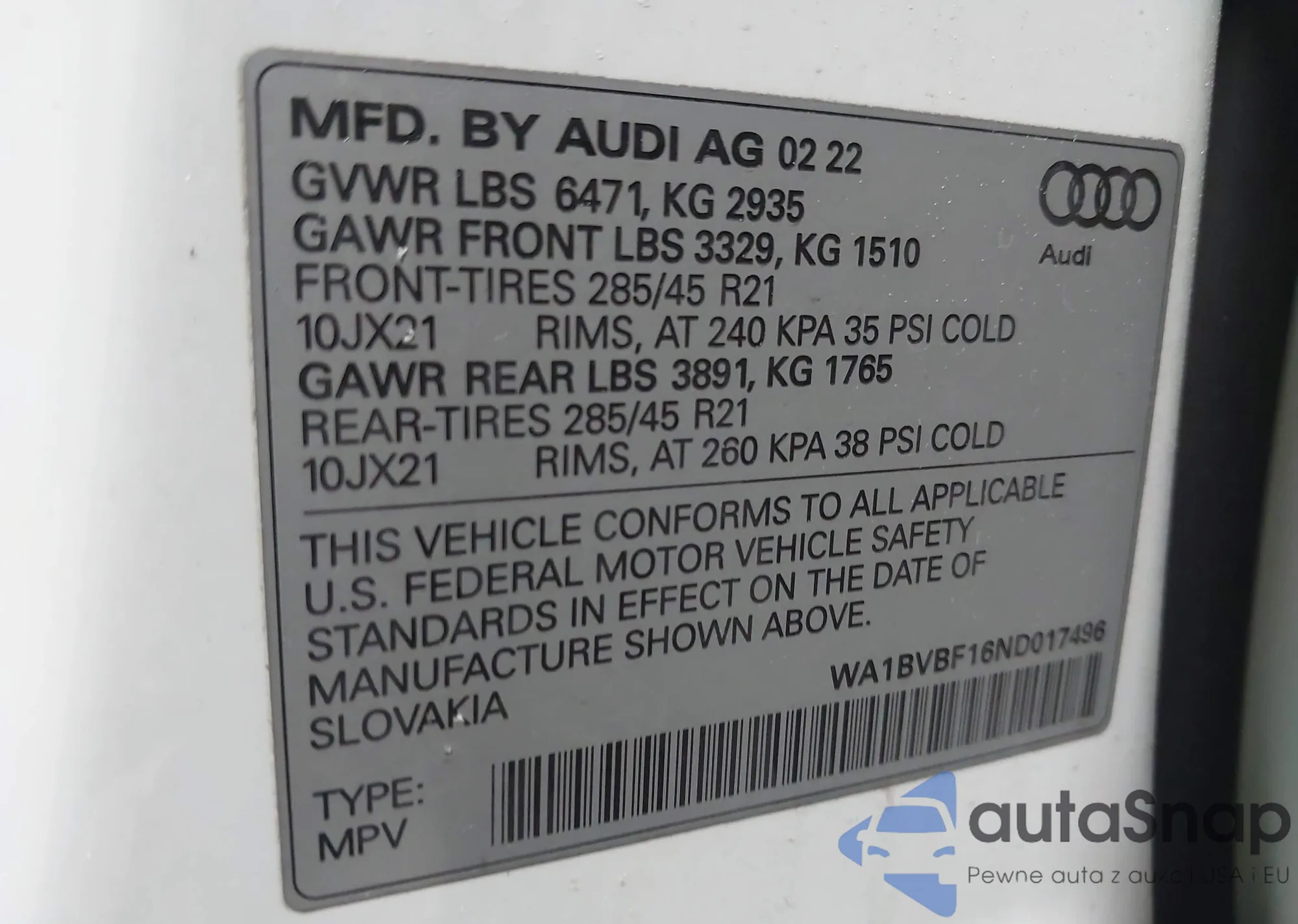 • VIN: WA1BVBF16ND017496