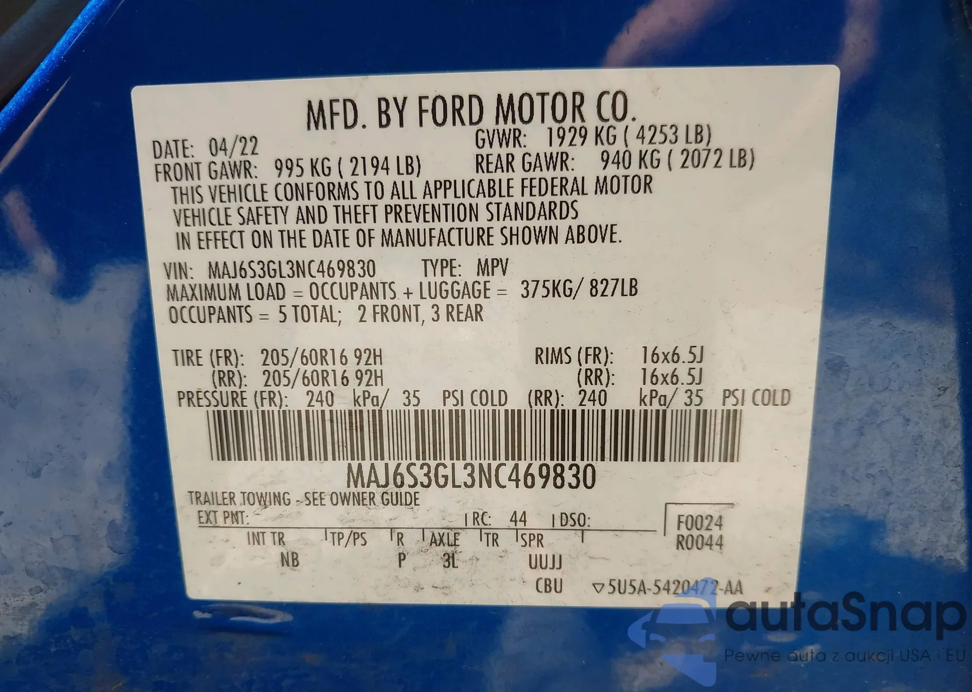 Автомобиль Ford EcoSport 2022 (VIN MAJ6S3GL3NC469830) ранее не участвовал в торгах. Документы чистые, пробег соответствует или ниже среднего по рынку. Продаётся страховой компанией — рекомендуем покупку. Доставка в порт займет около 6–8 недель.