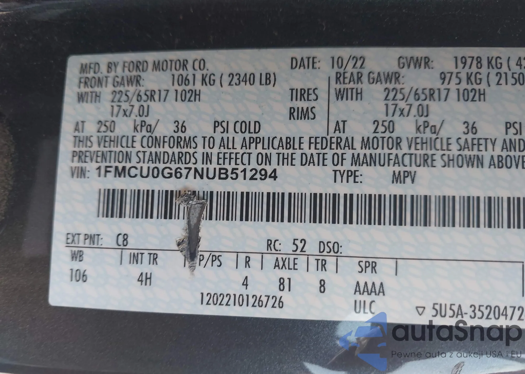 • VIN: 1FMCU0G67NUB51294