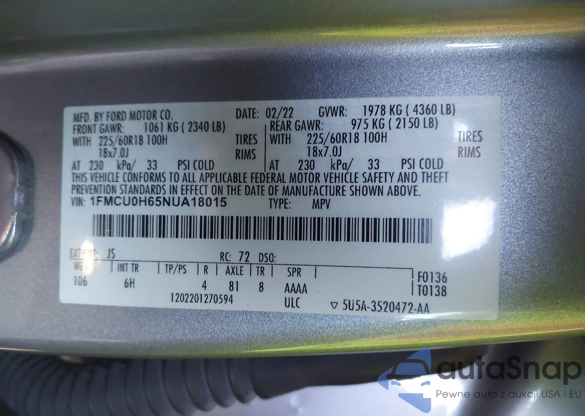 • VIN: 1FMCU0H65NUA18015