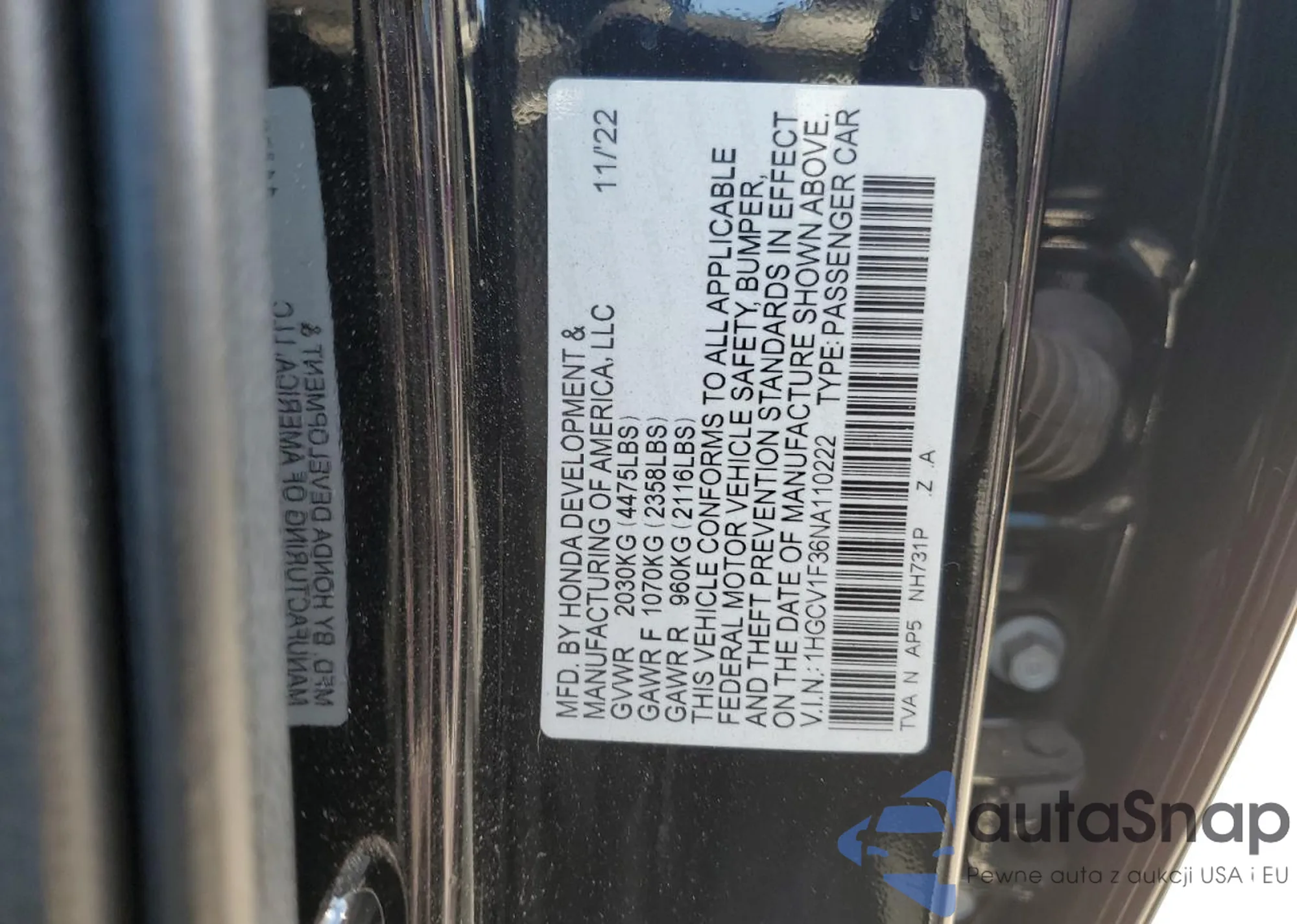 Автомобиль Honda Accord 2022 (VIN 1HGCV1F36NA110222) ранее не участвовал в торгах. Документы чистые, пробег соответствует или ниже среднего по рынку. Продаётся страховой компанией — рекомендуем покупку. Доставка в порт займет около 6–8 недель.