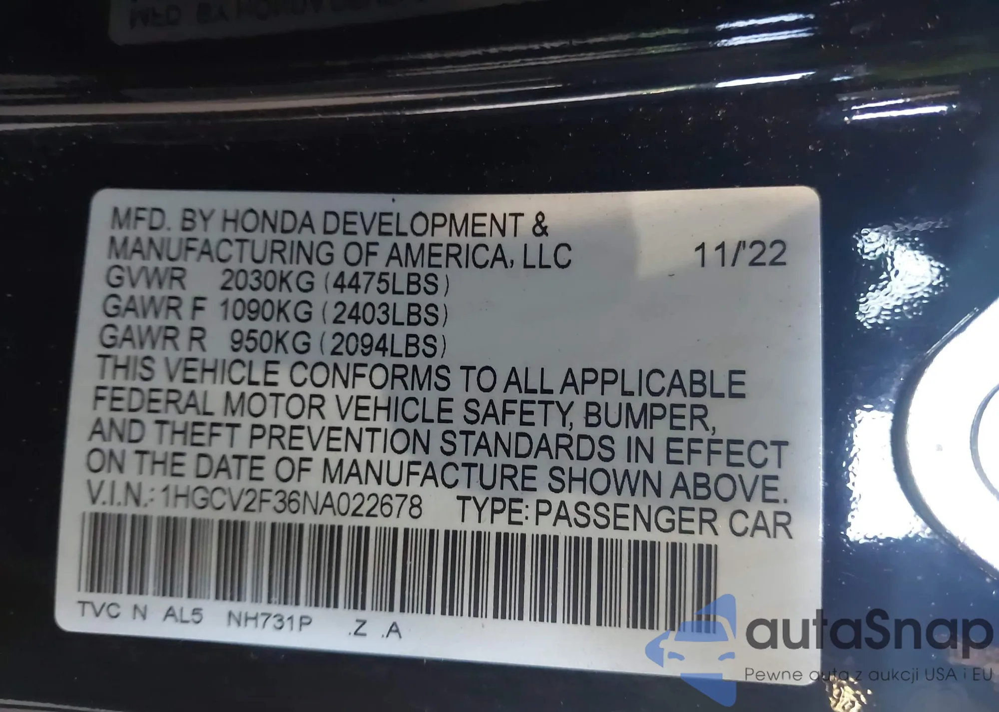 VIN: 1HGCV2F36NA022678