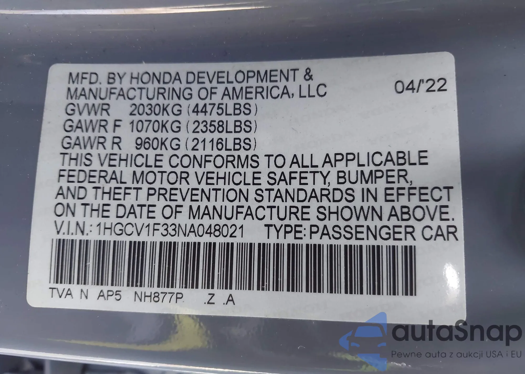 VIN: 1HGCV1F33NA048021