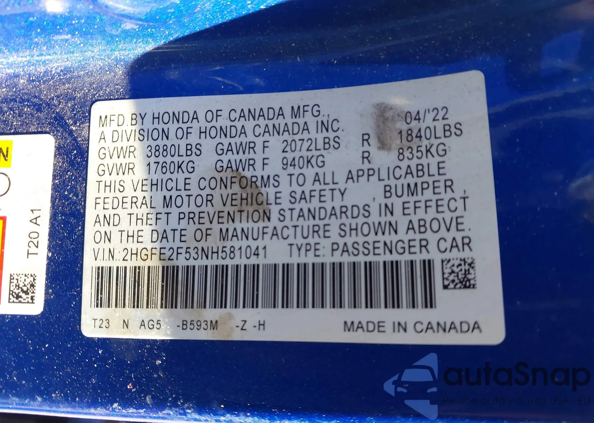 VIN: 2HGFE2F53NH581041