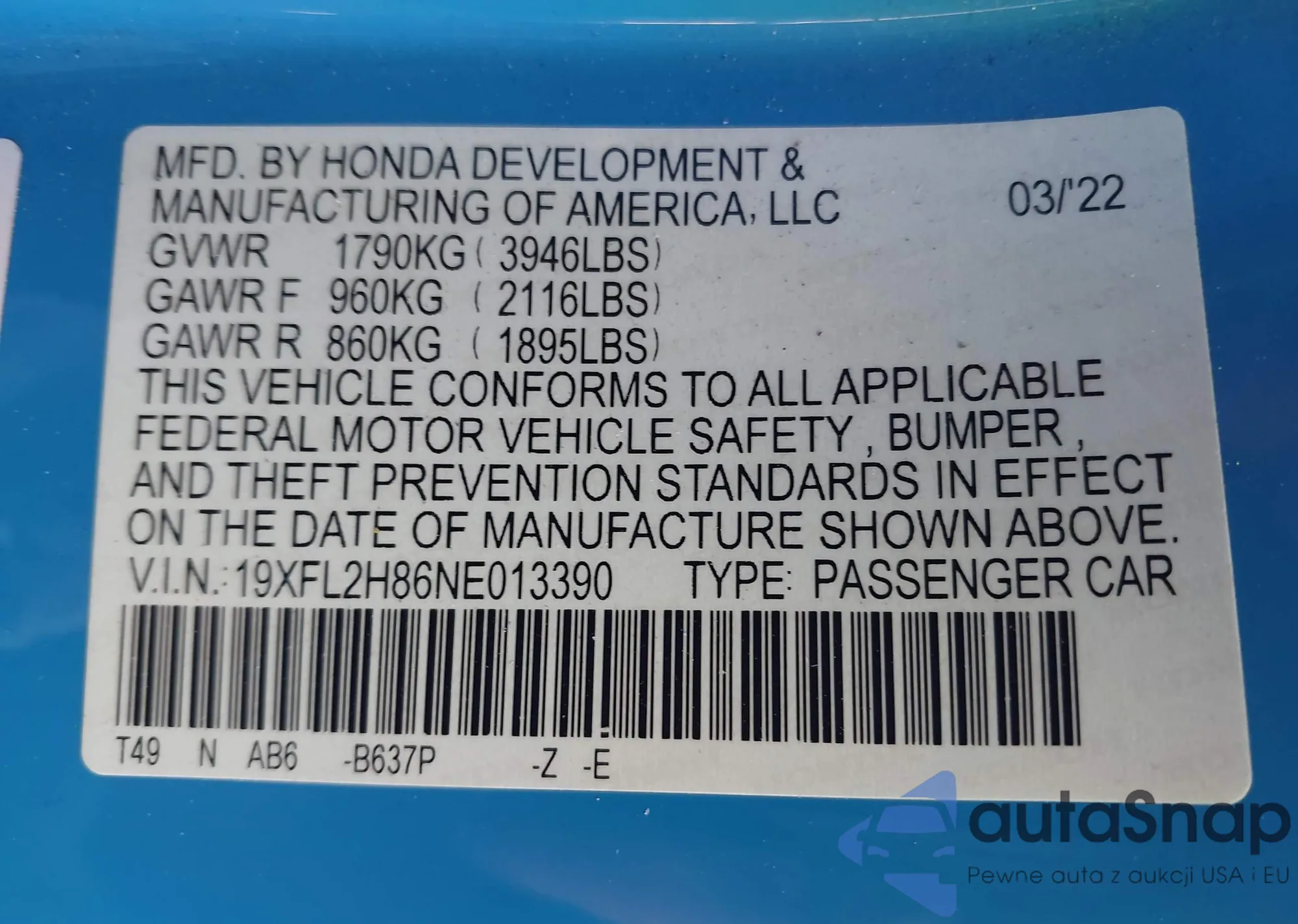 VIN: 19XFL2H86NE013390
