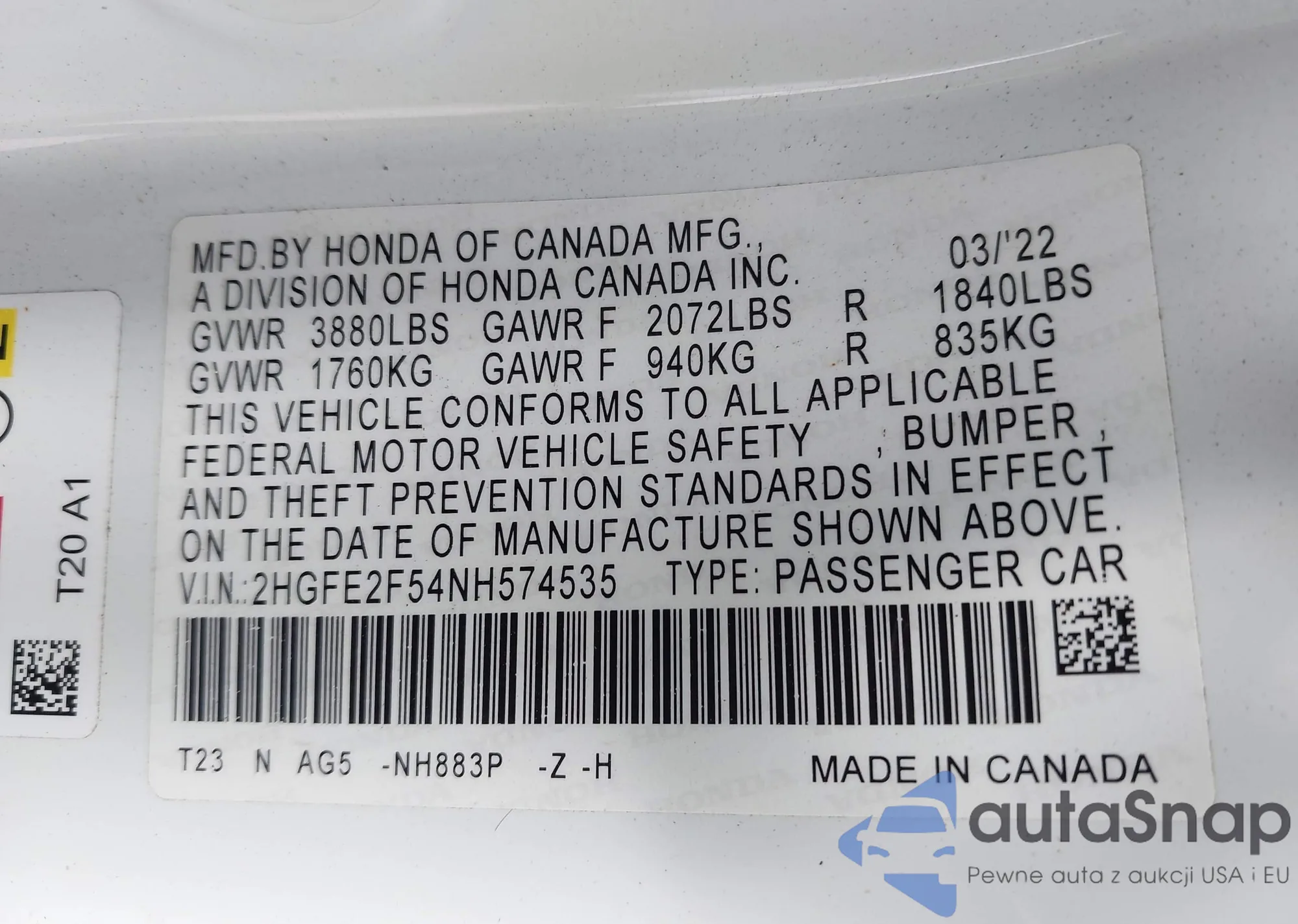 VIN: 2HGFE2F54NH574535