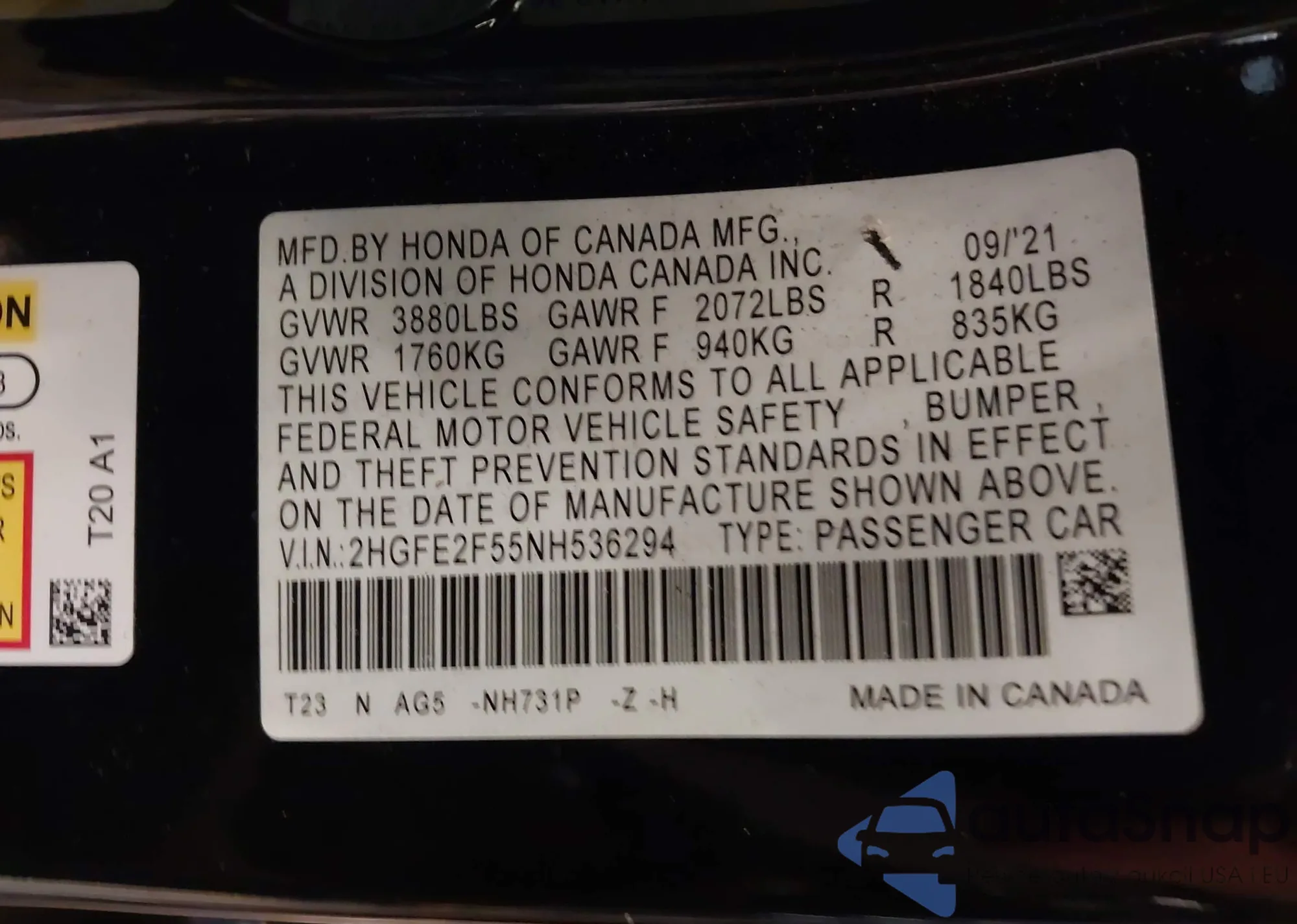VIN: 2HGFE2F55NH536294
