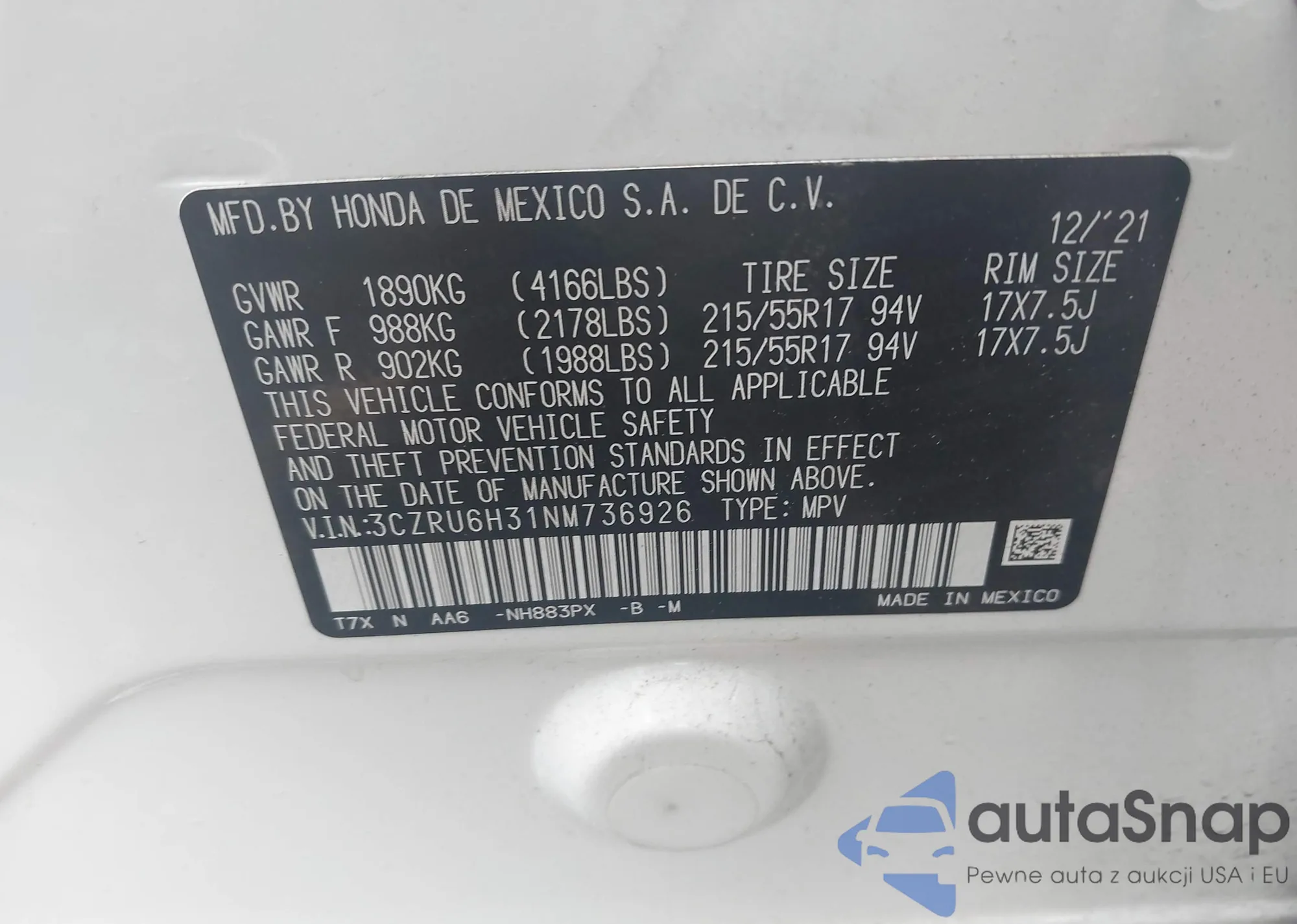 VIN: 3CZRU6H31NM736926