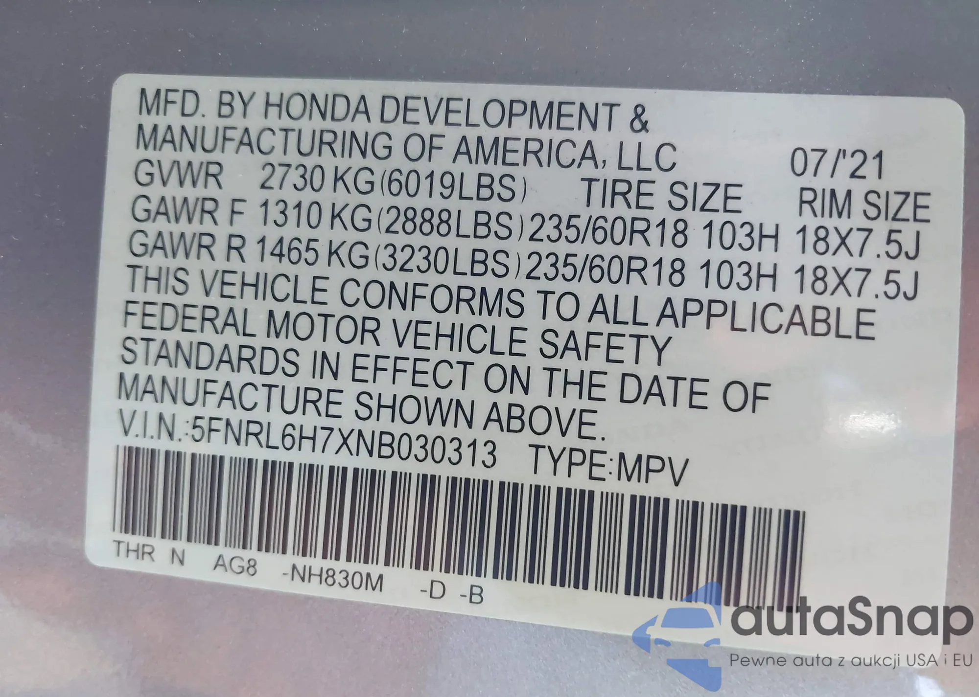 • VIN: 5FNRL6H7XNB030313