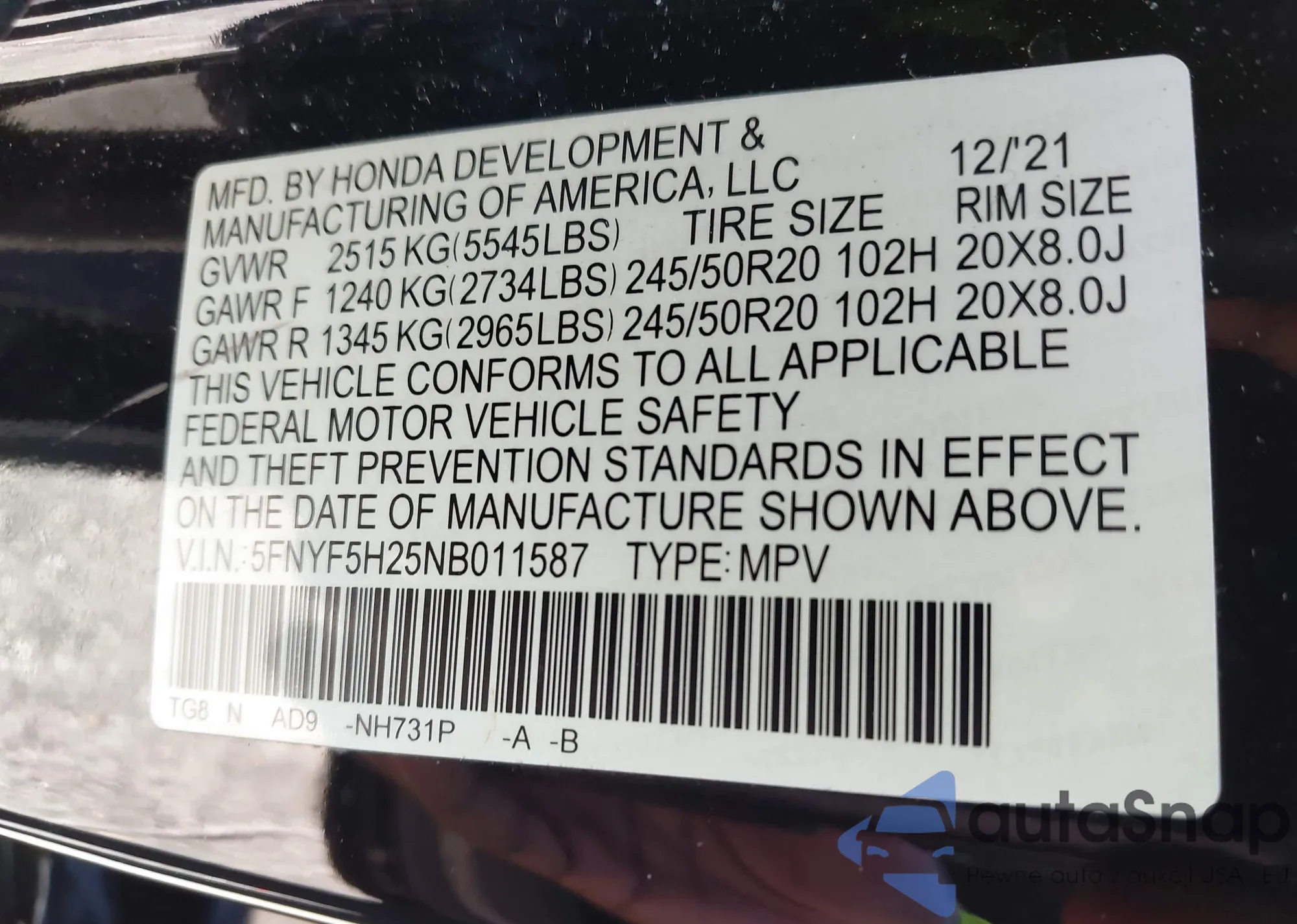 VIN: 5FNYF5H25NB011587