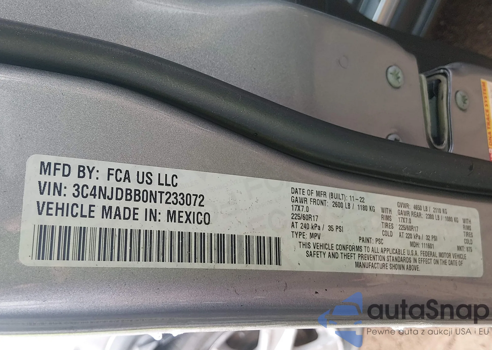 Автомобиль Jeep Compass 2022 (VIN 3C4NJDBB0NT233072) ранее не участвовал в торгах. Документы чистые, пробег соответствует или ниже среднего по рынку. Продаётся страховой компанией — рекомендуем покупку. Доставка в порт займет около 6–8 недель.