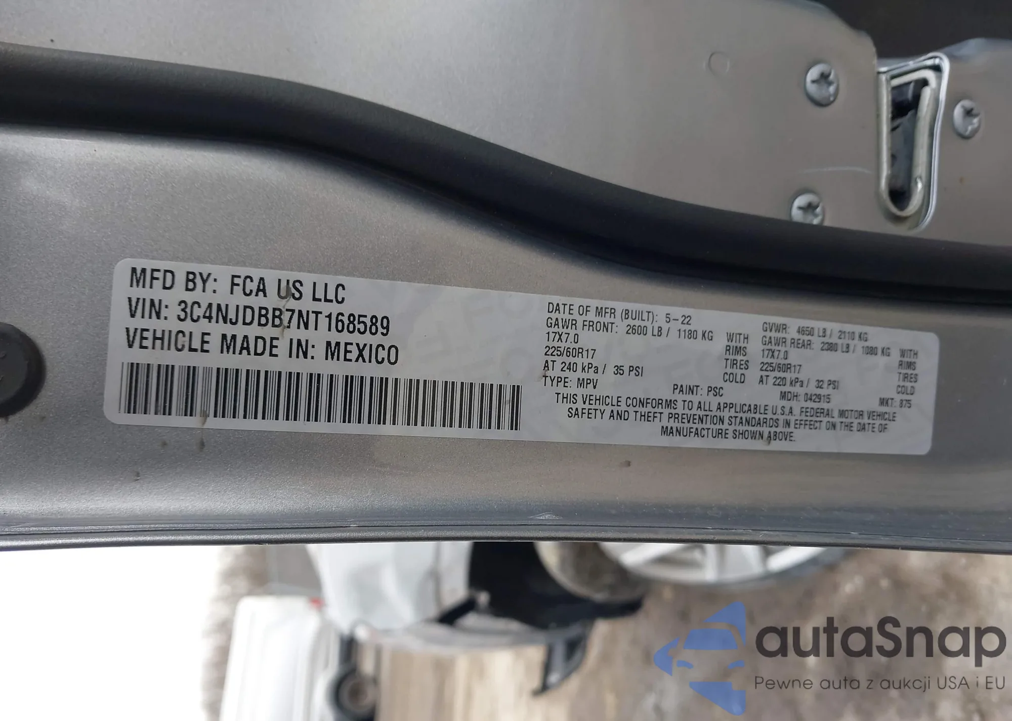 Автомобиль Jeep Compass 2022 (VIN 3C4NJDBB7NT168589) ранее не участвовал в торгах. Документы чистые, пробег соответствует или ниже среднего по рынку. Продаётся страховой компанией — рекомендуем покупку. Доставка в порт займет около 6–8 недель.