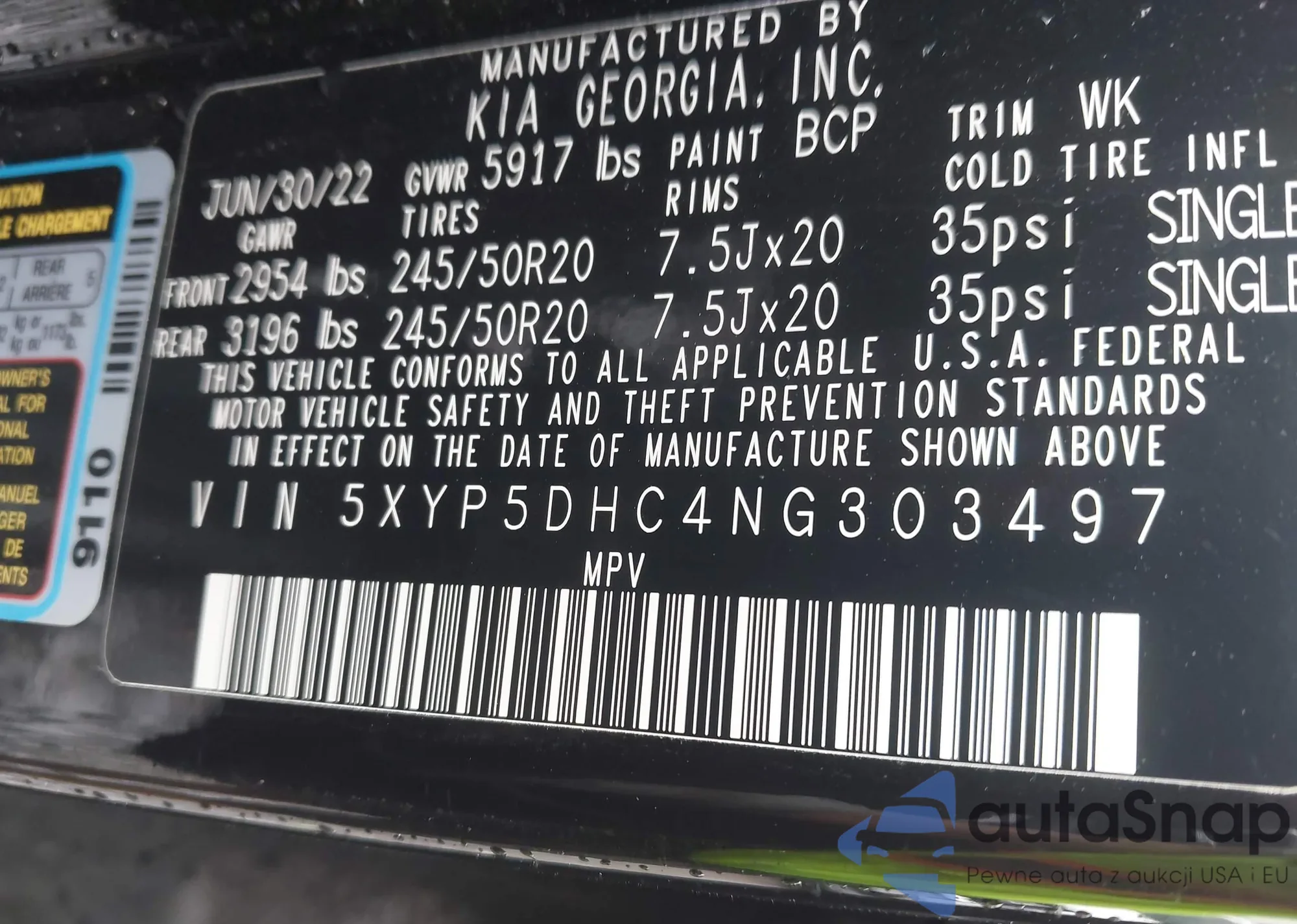 VIN: 5XYP5DHC4NG303497
