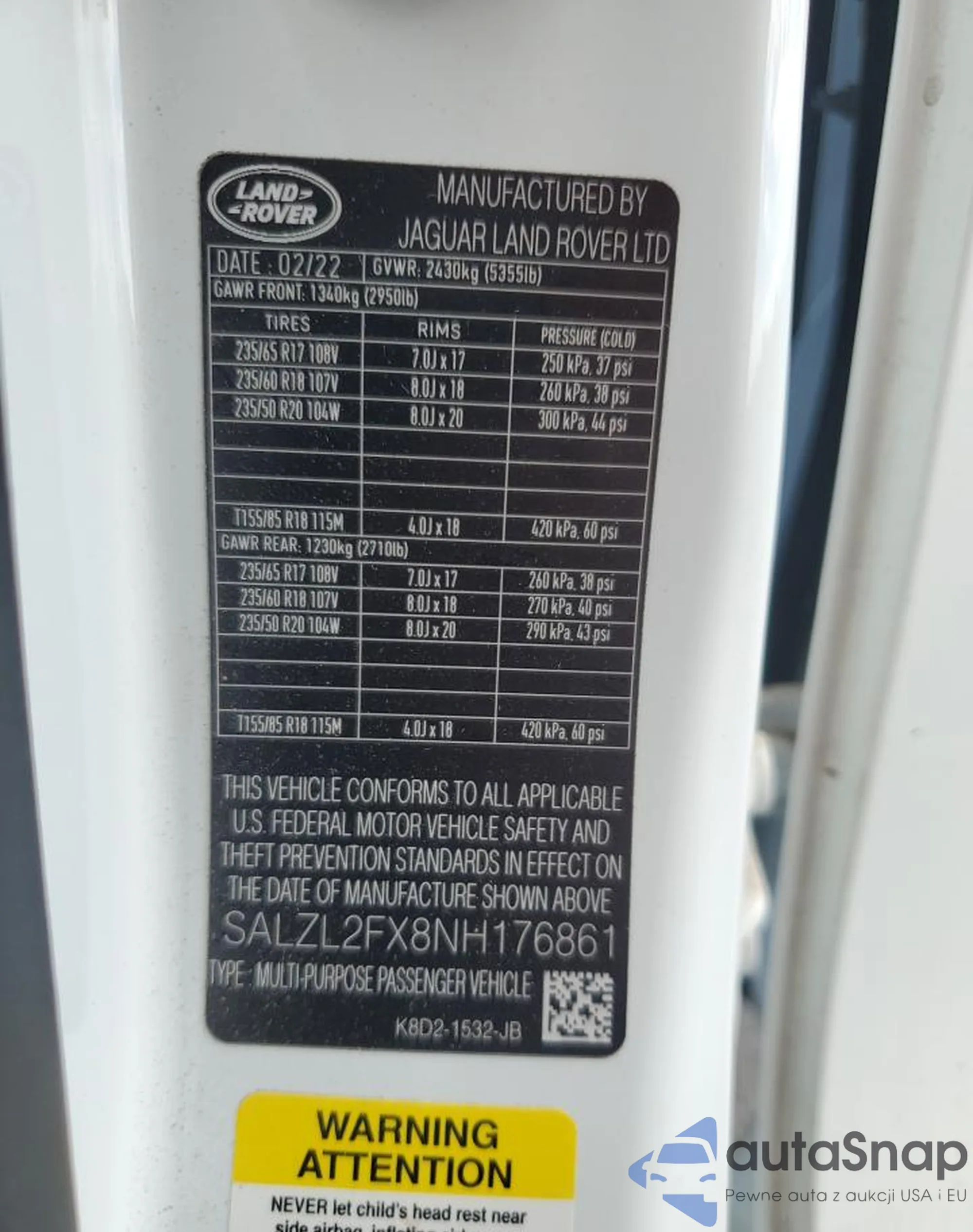 Автомобиль Land Rover Range Rover 2022 (VIN SALZL2FX8NH176861) ранее не участвовал в торгах. Документы чистые, пробег соответствует или ниже среднего по рынку. Продаётся страховой компанией — рекомендуем покупку. Доставка в порт займет около 6–8 недель.