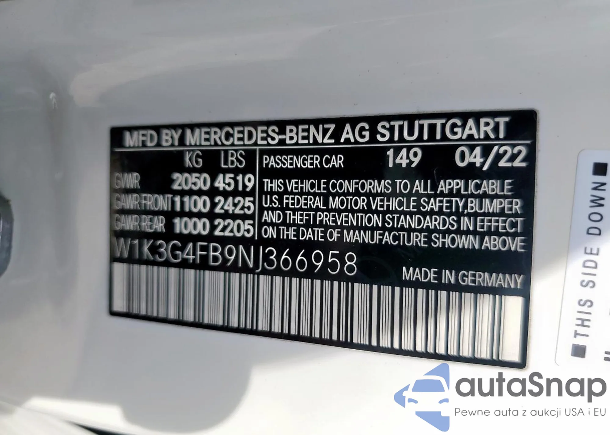 VIN: W1K3G4FB9NJ366958