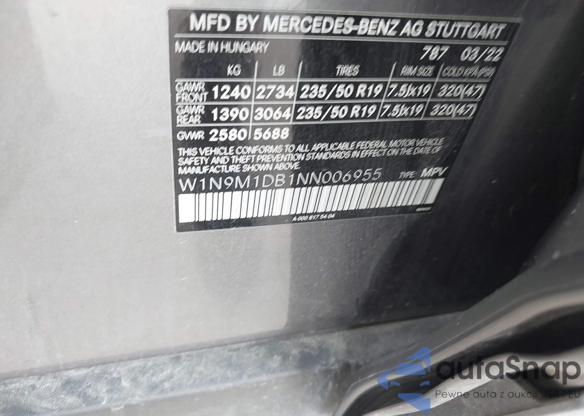 Автомобиль Mercedes-Benz EQB 2022 (VIN W1N9M1DB1NN006955) ранее не участвовал в торгах. Документы чистые, пробег соответствует или ниже среднего по рынку. Продаётся страховой компанией — рекомендуем покупку. Доставка в порт займет около 6–8 недель.