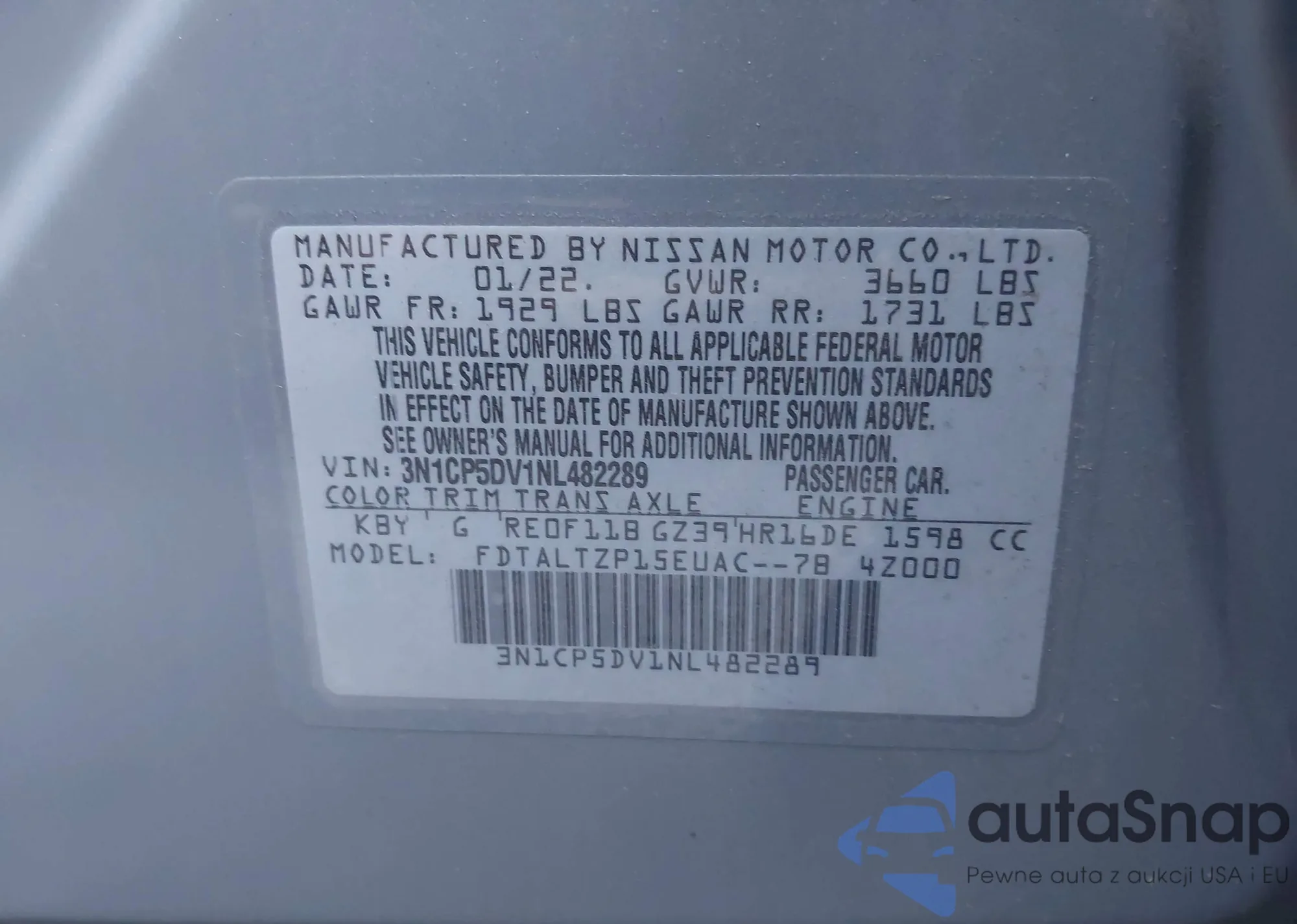 • VIN: 3N1CP5DV1NL482289