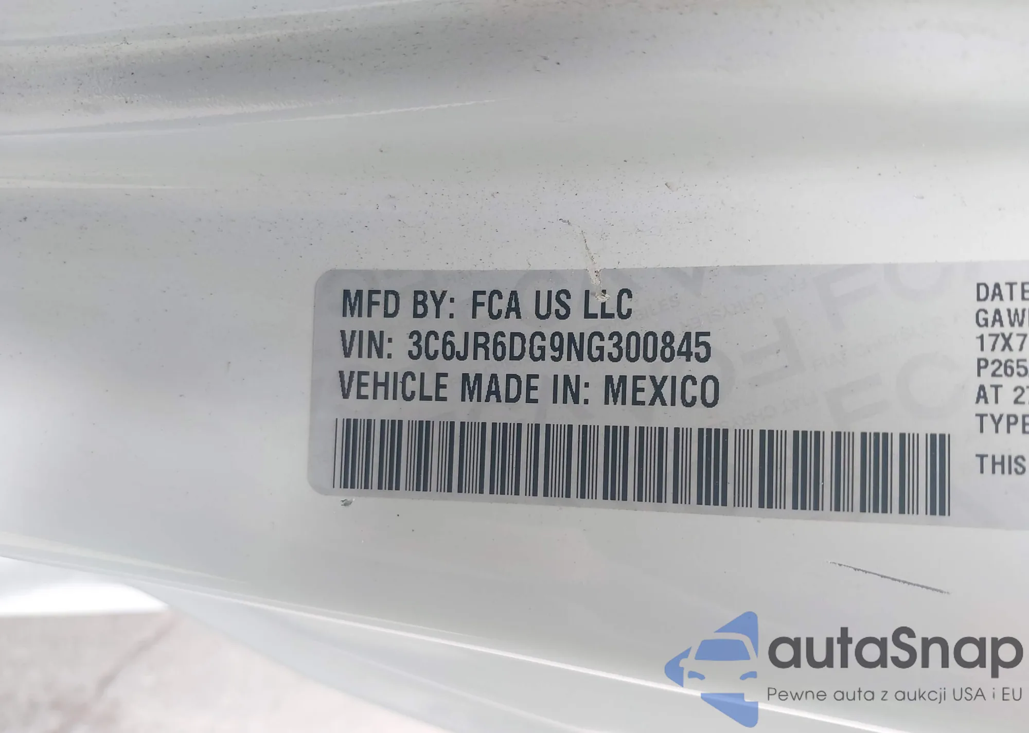 VIN: 3C6JR6DG9NG300845