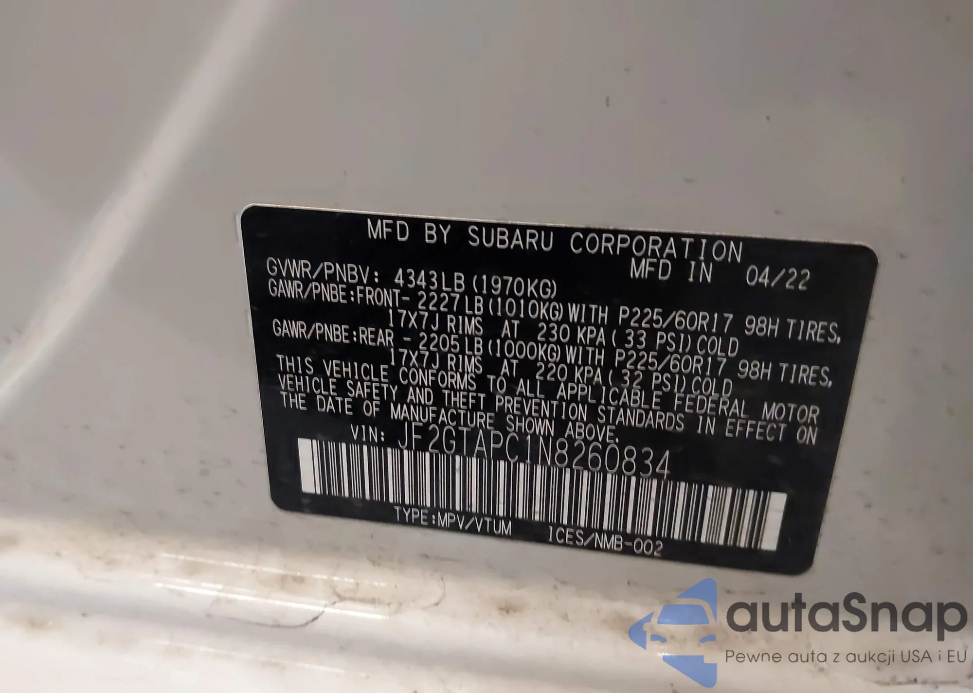 VIN: JF2GTAPC1N8260834