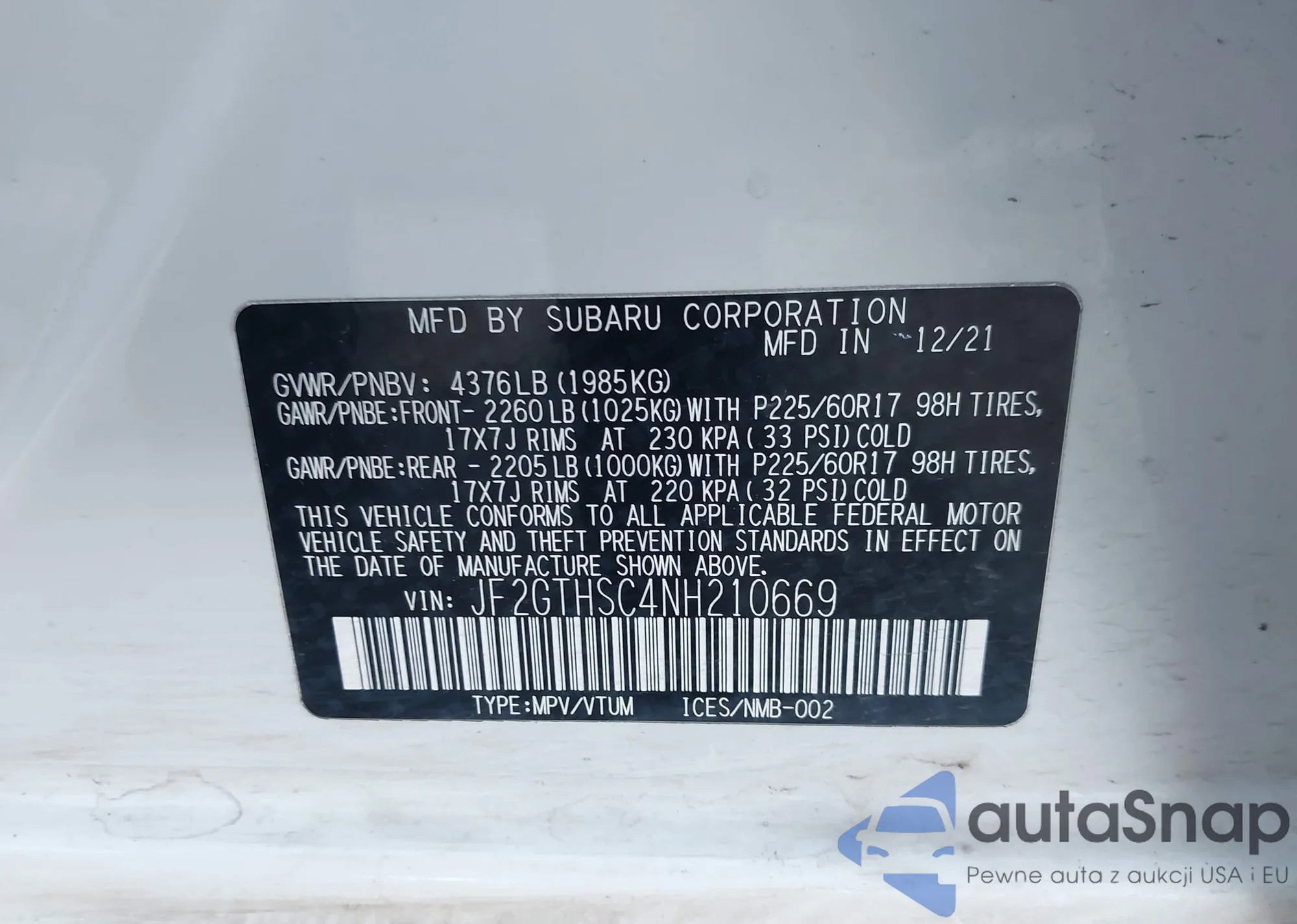 • VIN: JF2GTHSC4NH210669