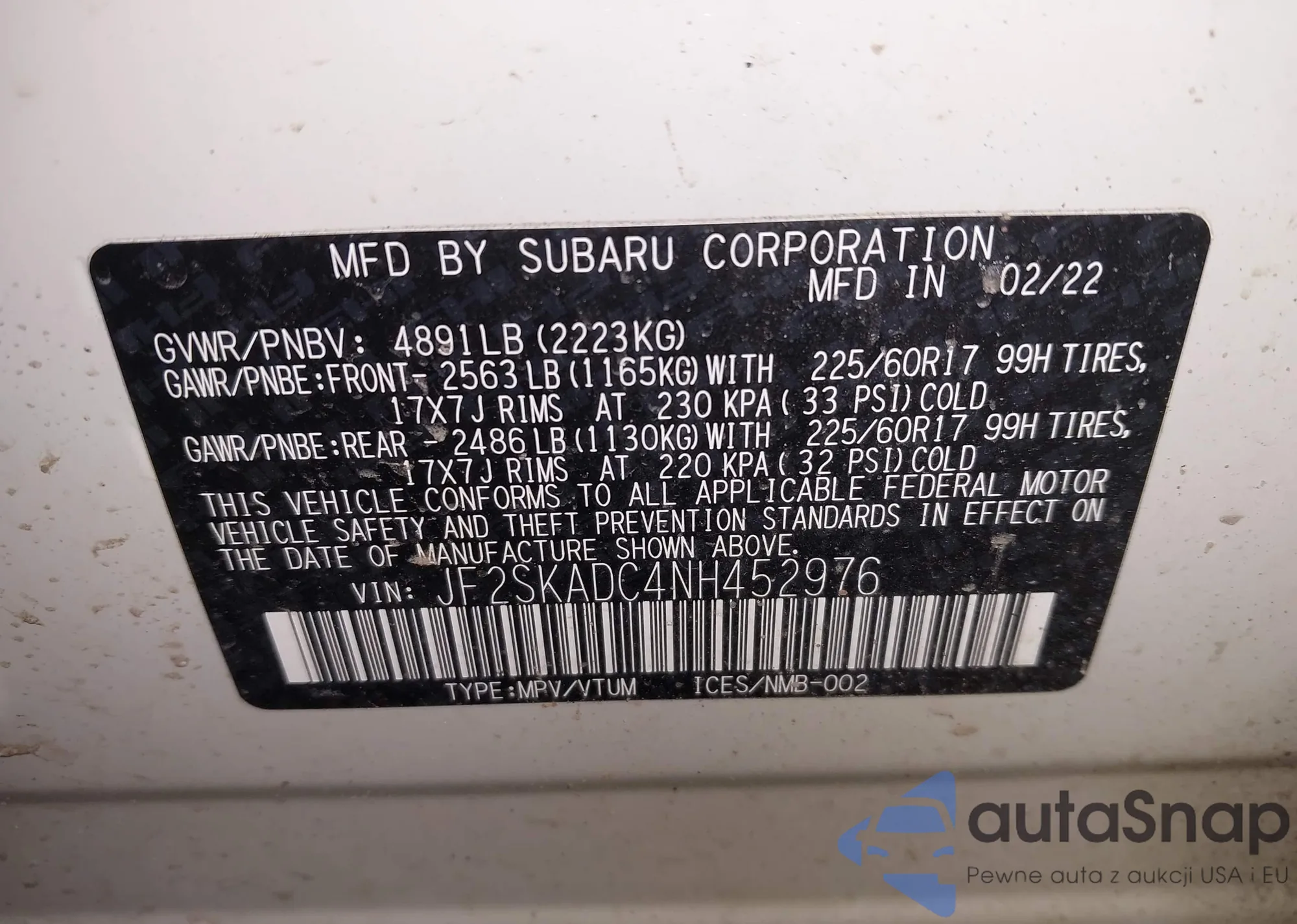 Автомобиль Subaru Forester 2022 (VIN JF2SKADC4NH452976) ранее не участвовал в торгах. Документы чистые, пробег соответствует или ниже среднего по рынку. Продаётся страховой компанией — рекомендуем покупку. Доставка в порт займет около 6–8 недель.