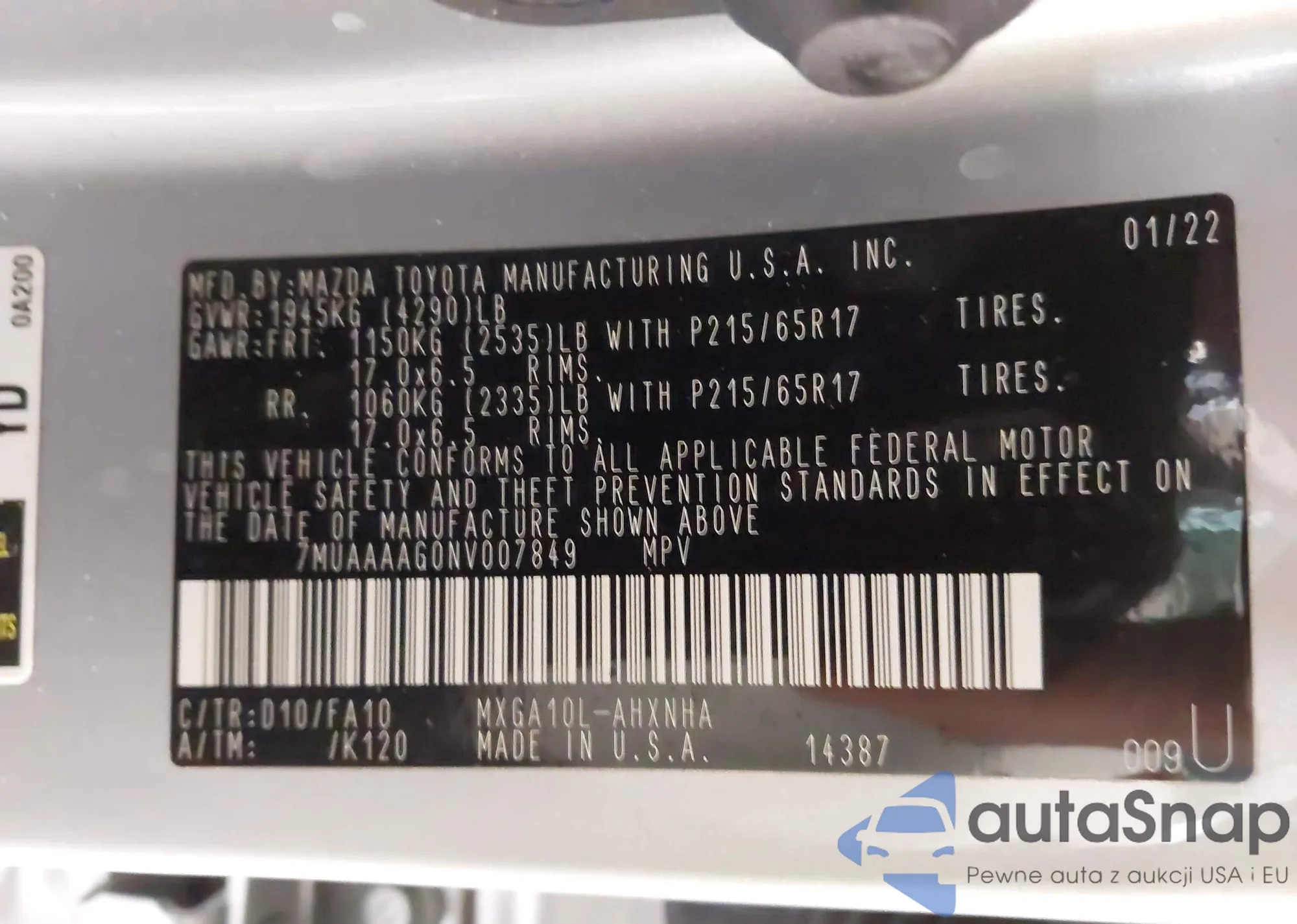 • VIN: 7MUAAAAG0NV007849