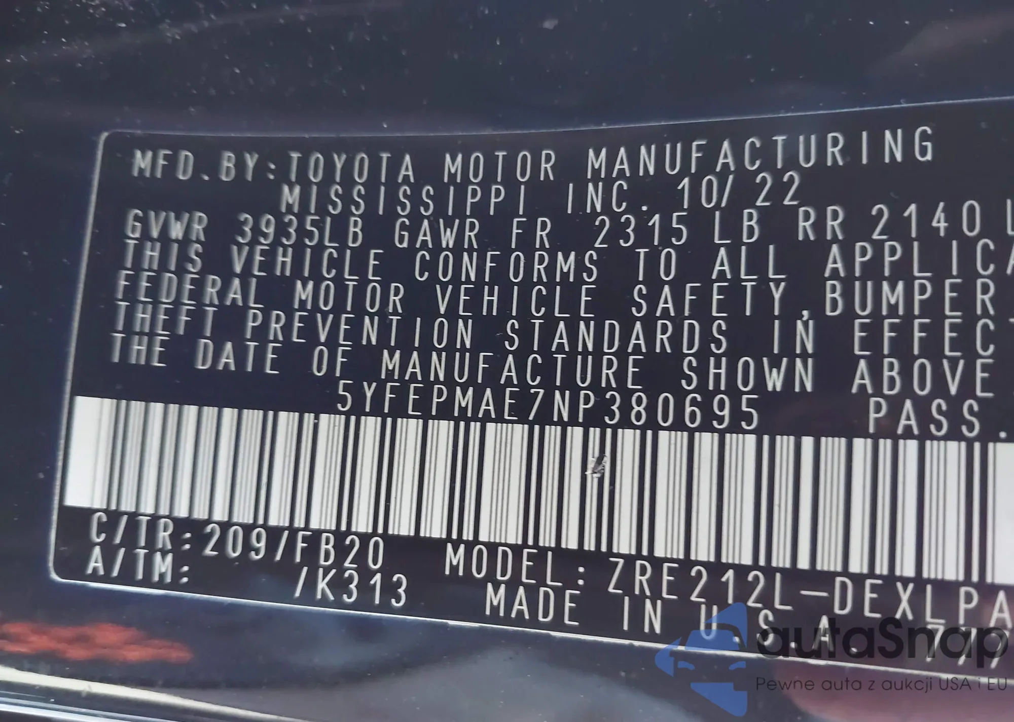 VIN: 5YFEPMAE7NP380695