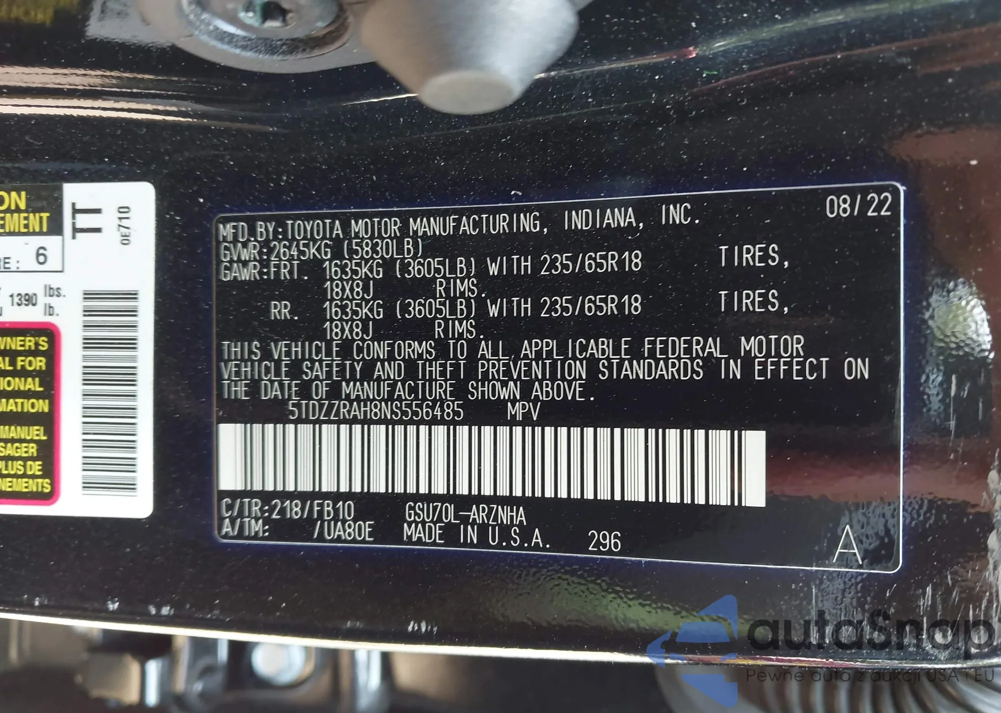 VIN: 5TDZZRAH8NS556485