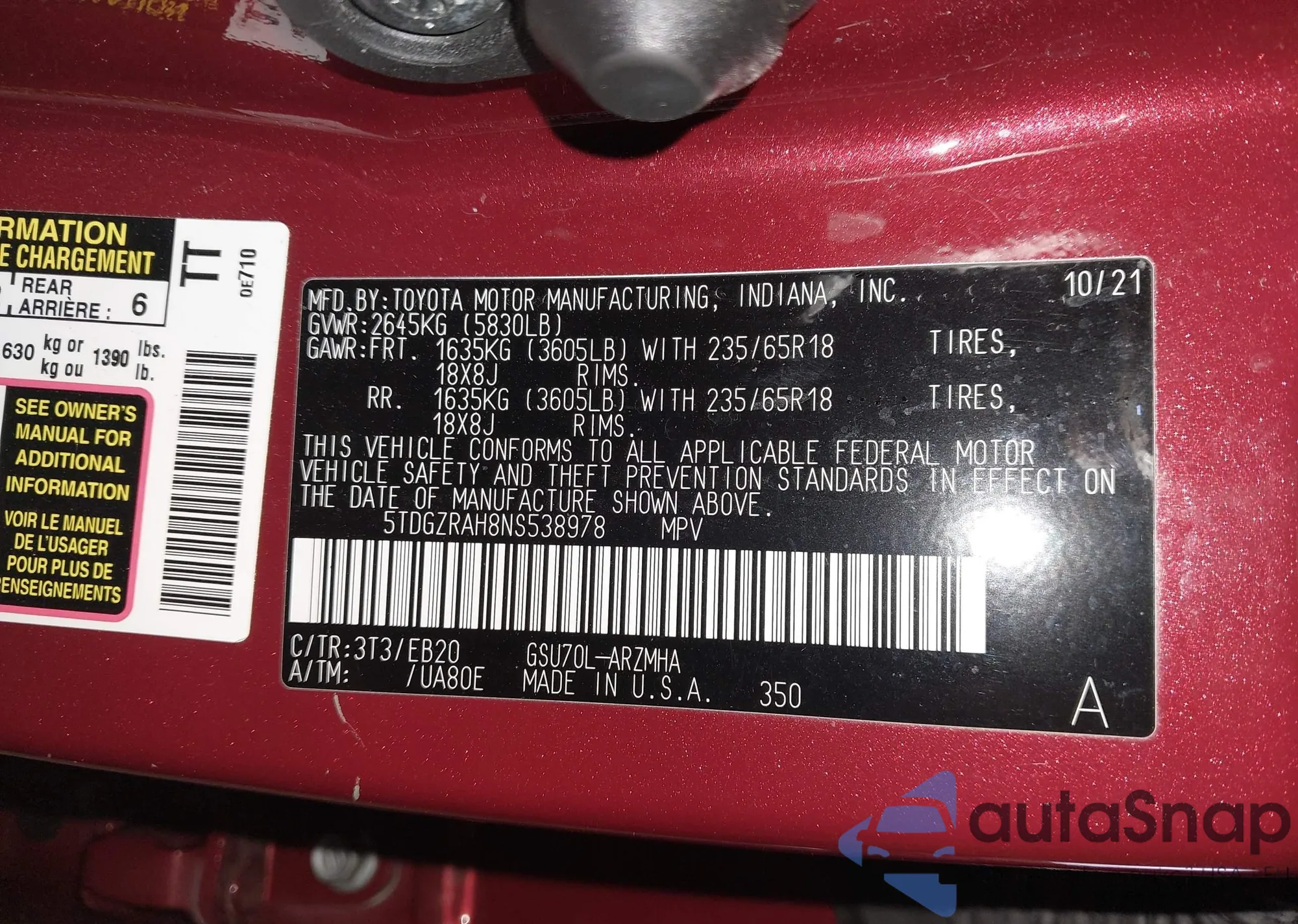 VIN: 5TDGZRAH8NS538978