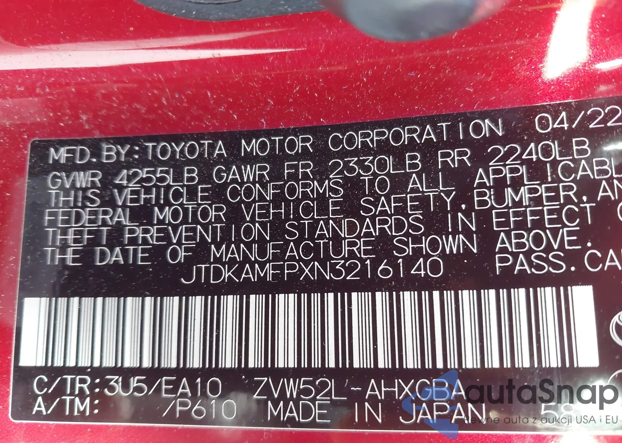 Автомобиль Toyota Prius 2022 (VIN JTDKAMFPXN3216140) ранее не участвовал в торгах. Документы чистые, пробег соответствует или ниже среднего по рынку. Продаётся страховой компанией — рекомендуем покупку. Доставка в порт займет около 6–8 недель.